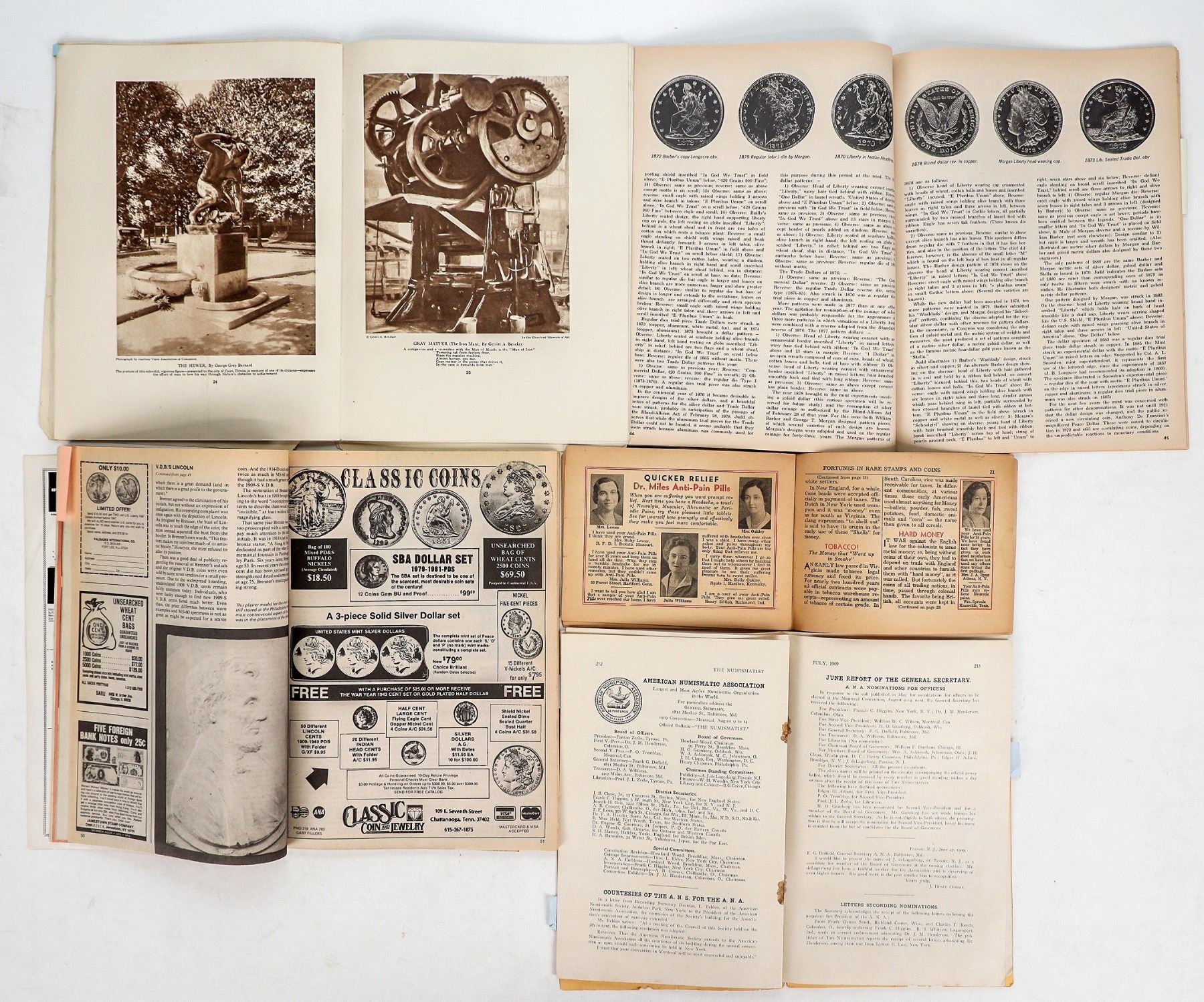 Five vintage coin publications: July 1909 Numismatist; October 1922 The Mentor "How Uncle Sam's Money is Made and Circulated"; "Fortunes in Rare Stamps and Coins" from Sohn's Drug Store, Xenia, Ohio; Coinage magazine, May 1967; Coinage Magazine February 1986 the beginning of official U. S. gold bullion.