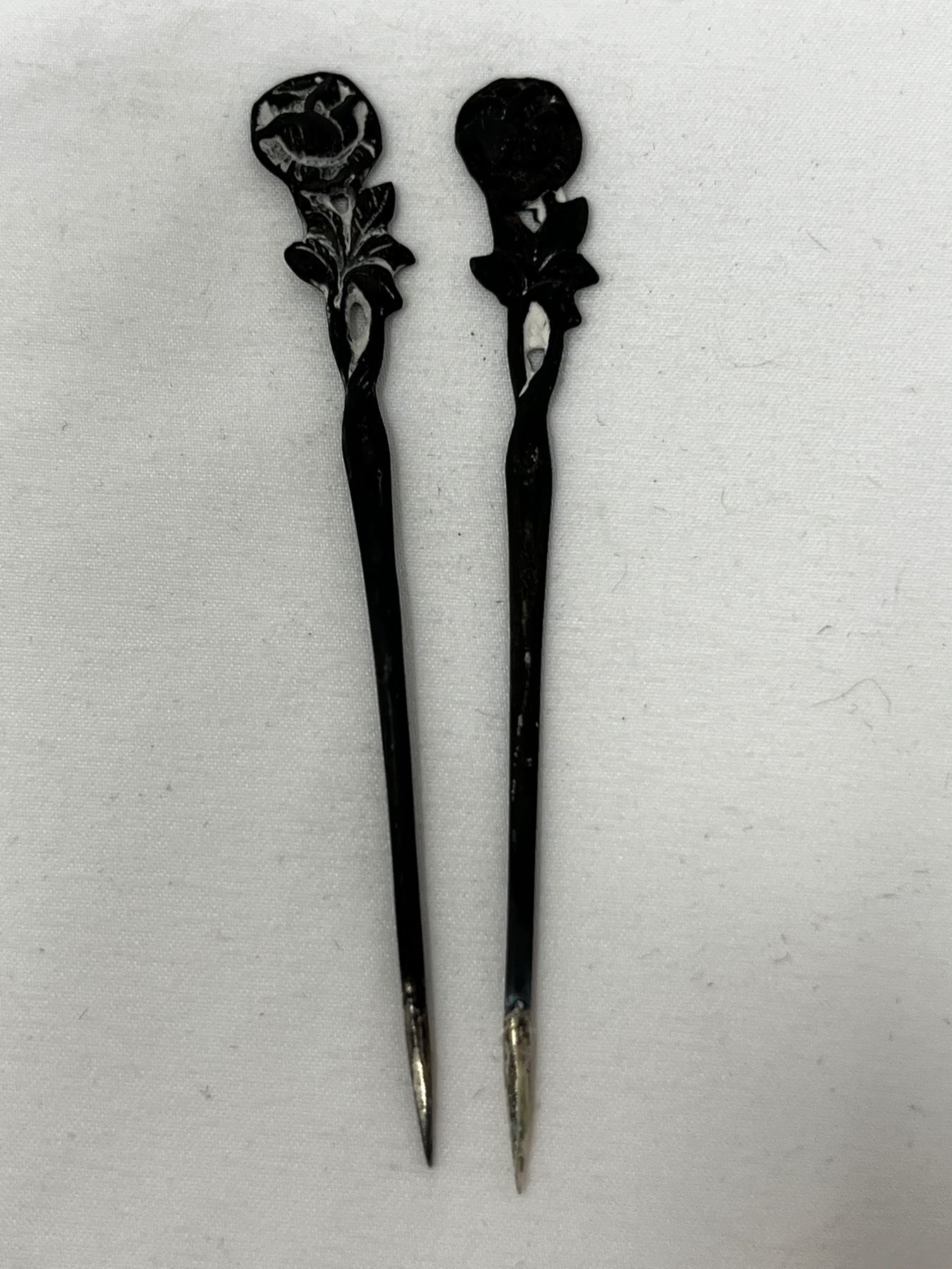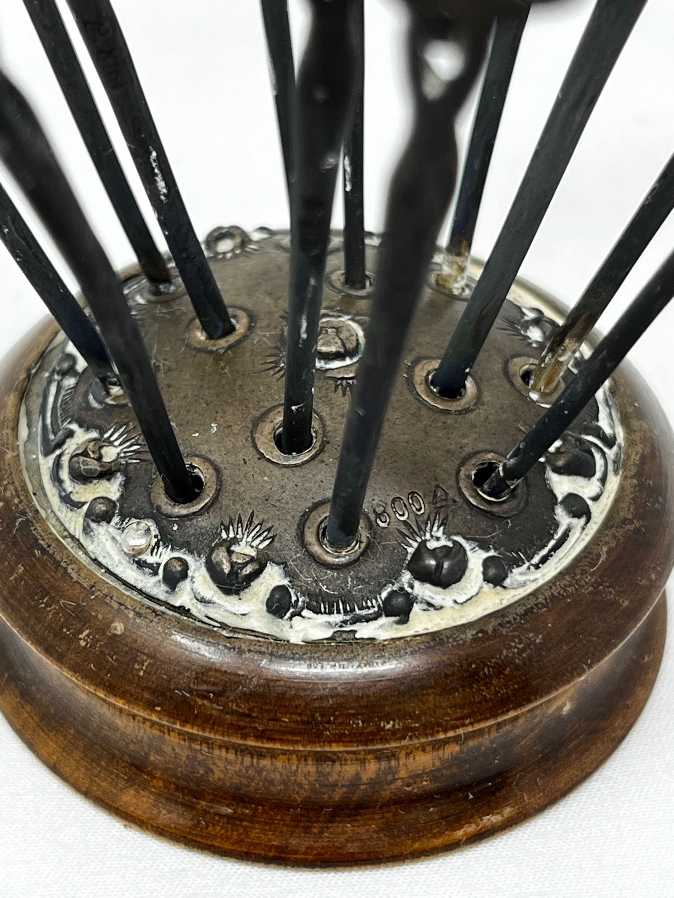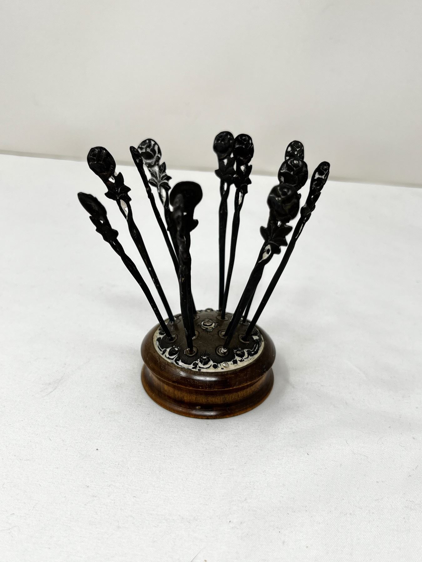 Vintage coin silver (.800 fine) horderve skewers with silver and wooden base 85 g total weight aprox 1.5oz actual silver weight (est.)`