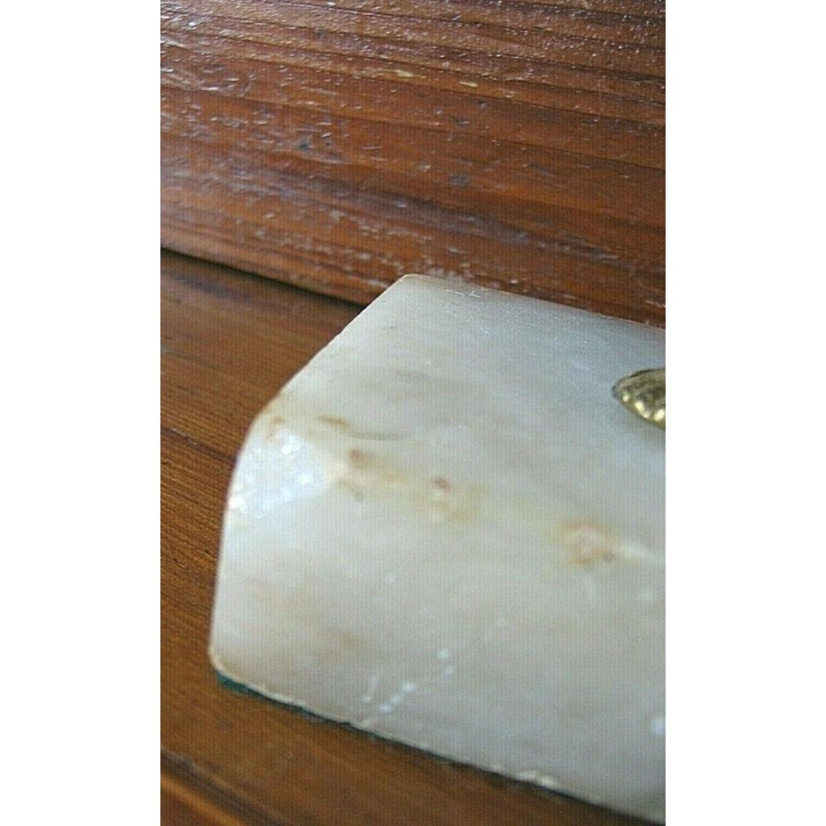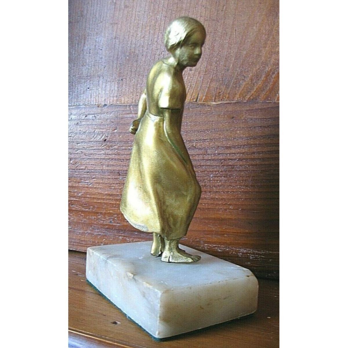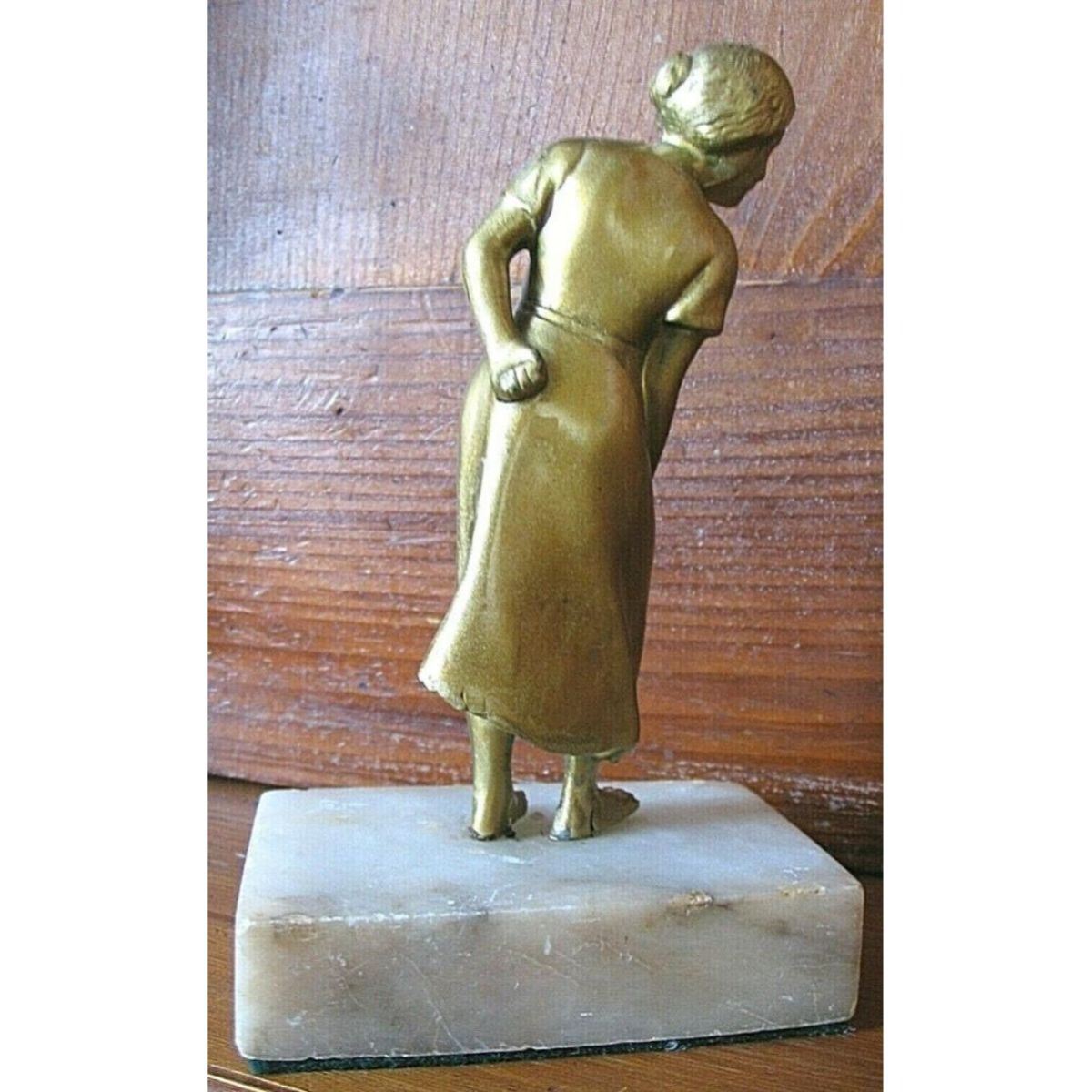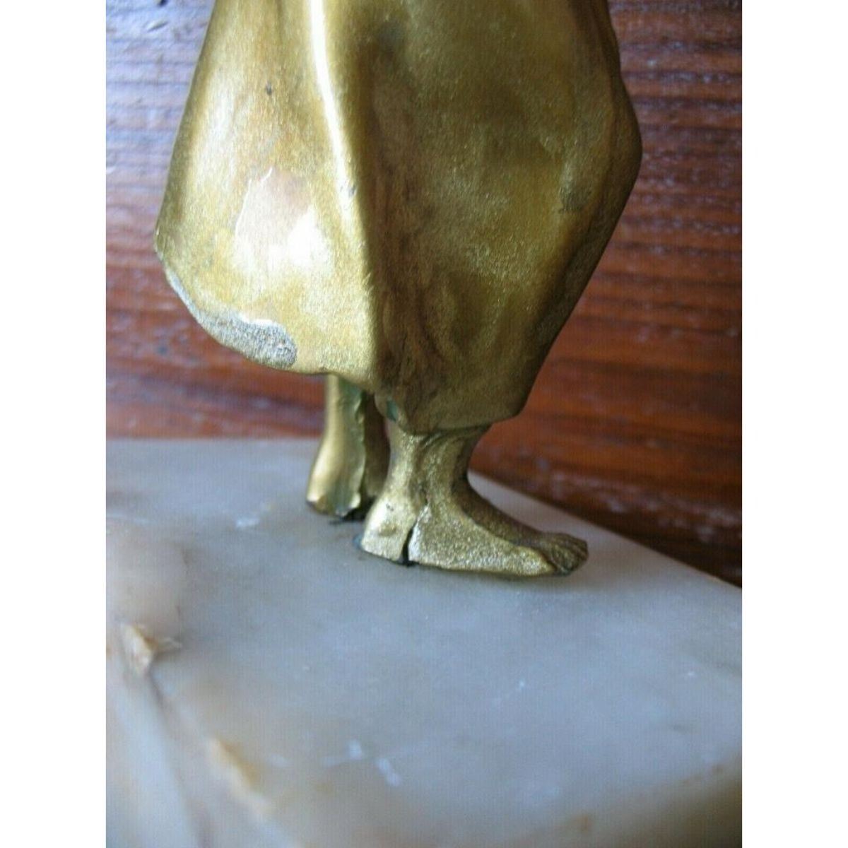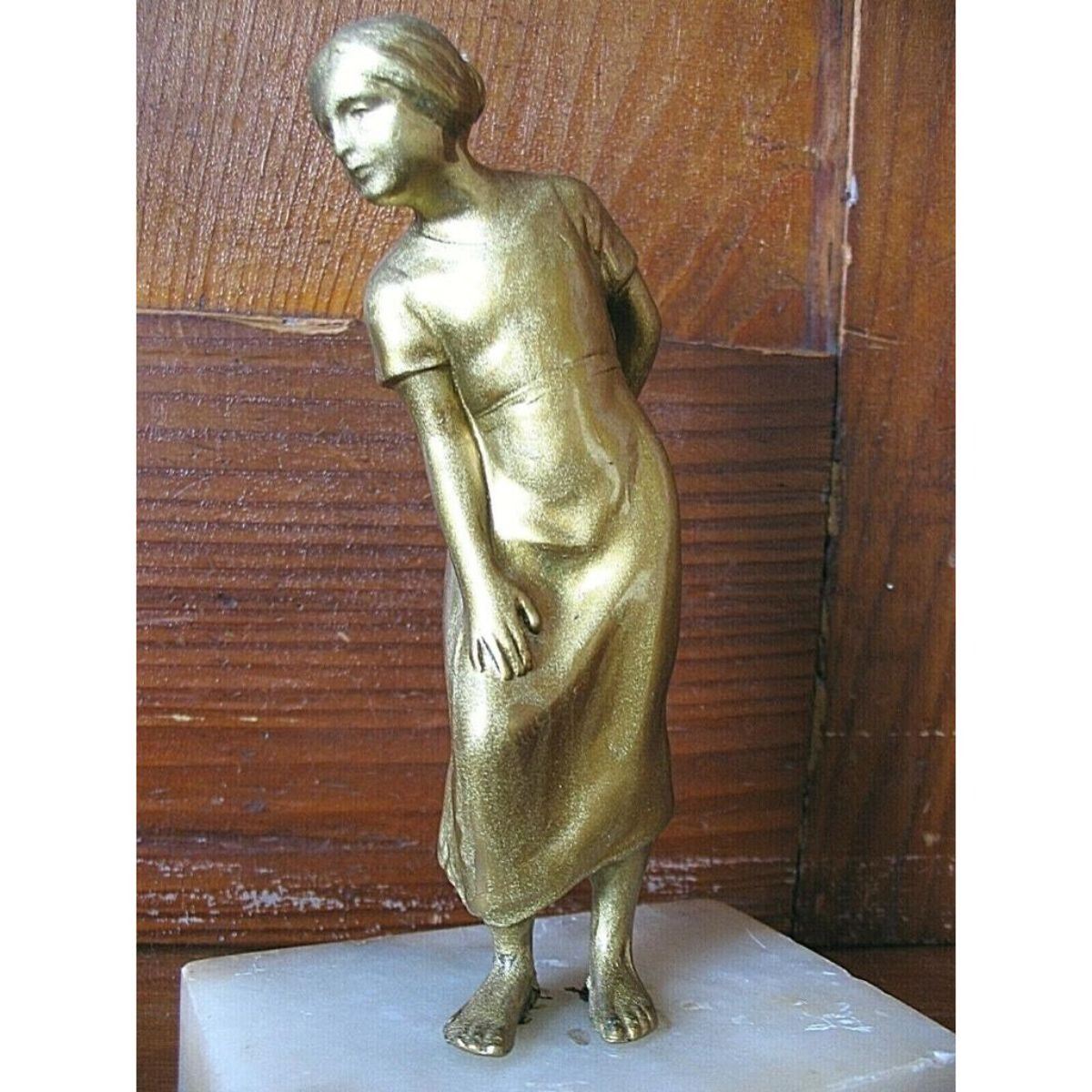 Early 1900's cold painted bronze figure of a young woman in natural pose mounted on a marble pedestal. Unknown maker. 6" H on pedestal, with figure itself measuring approx. 5" H. Approx. 1.25 lbs. * there is slight movement of the figure on the pedestal, also a small split on back right foot, not visible from the front. cold paint has a two-tone appearance to it, with some slight flow lines by the lower back hem & below her bent knee. small chip out of marble base, as seen in last photo. Â