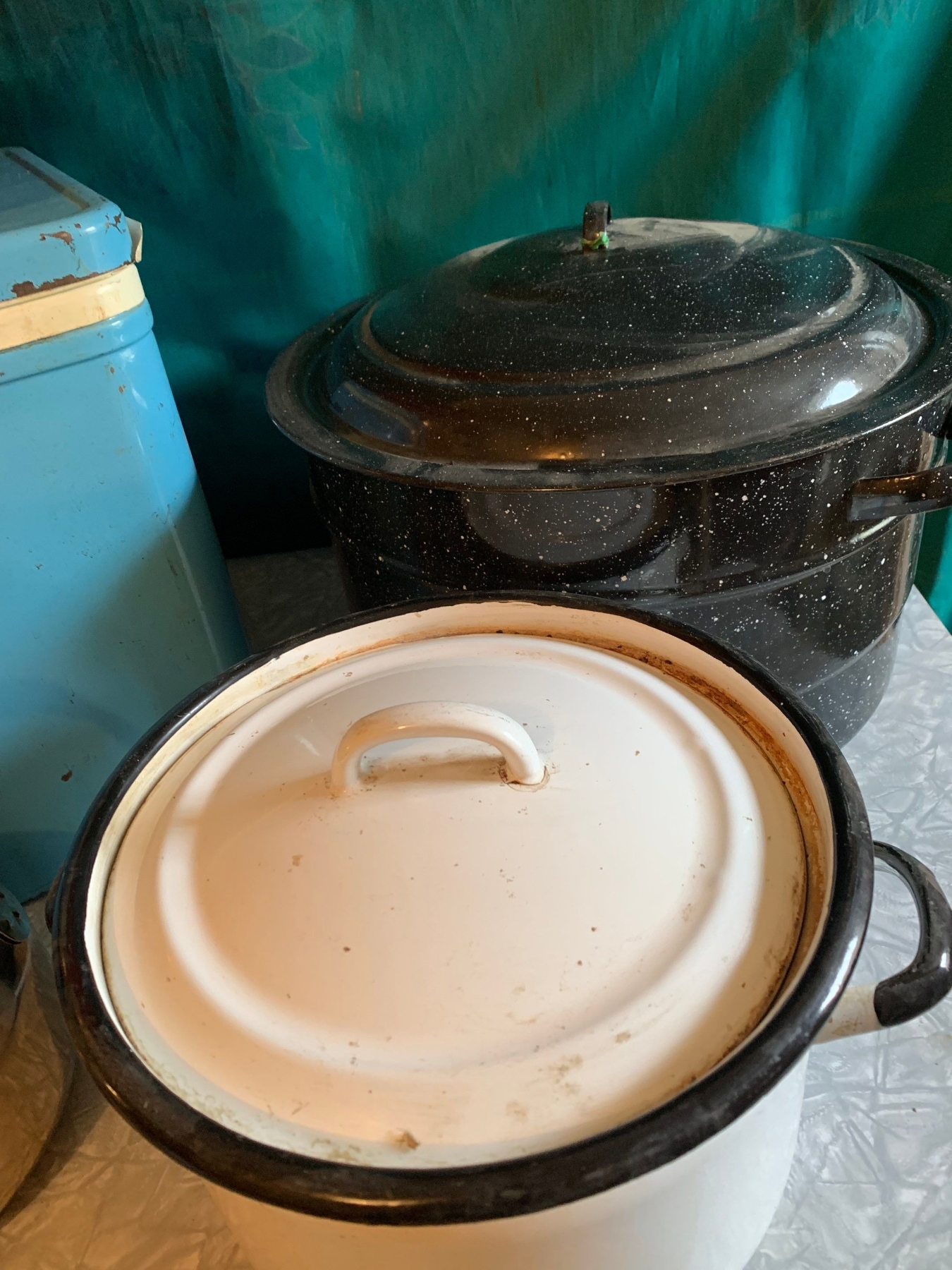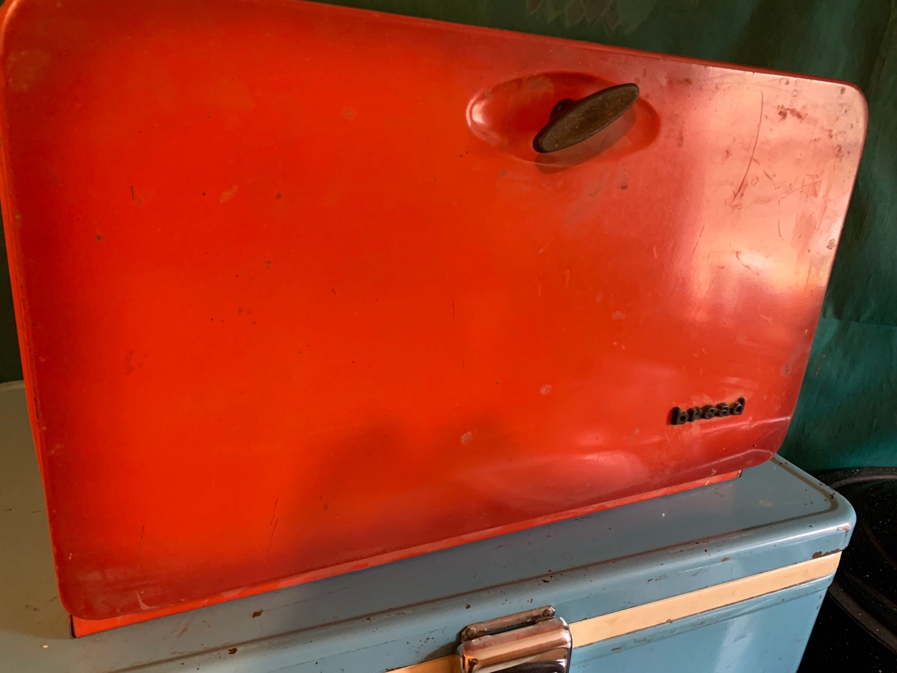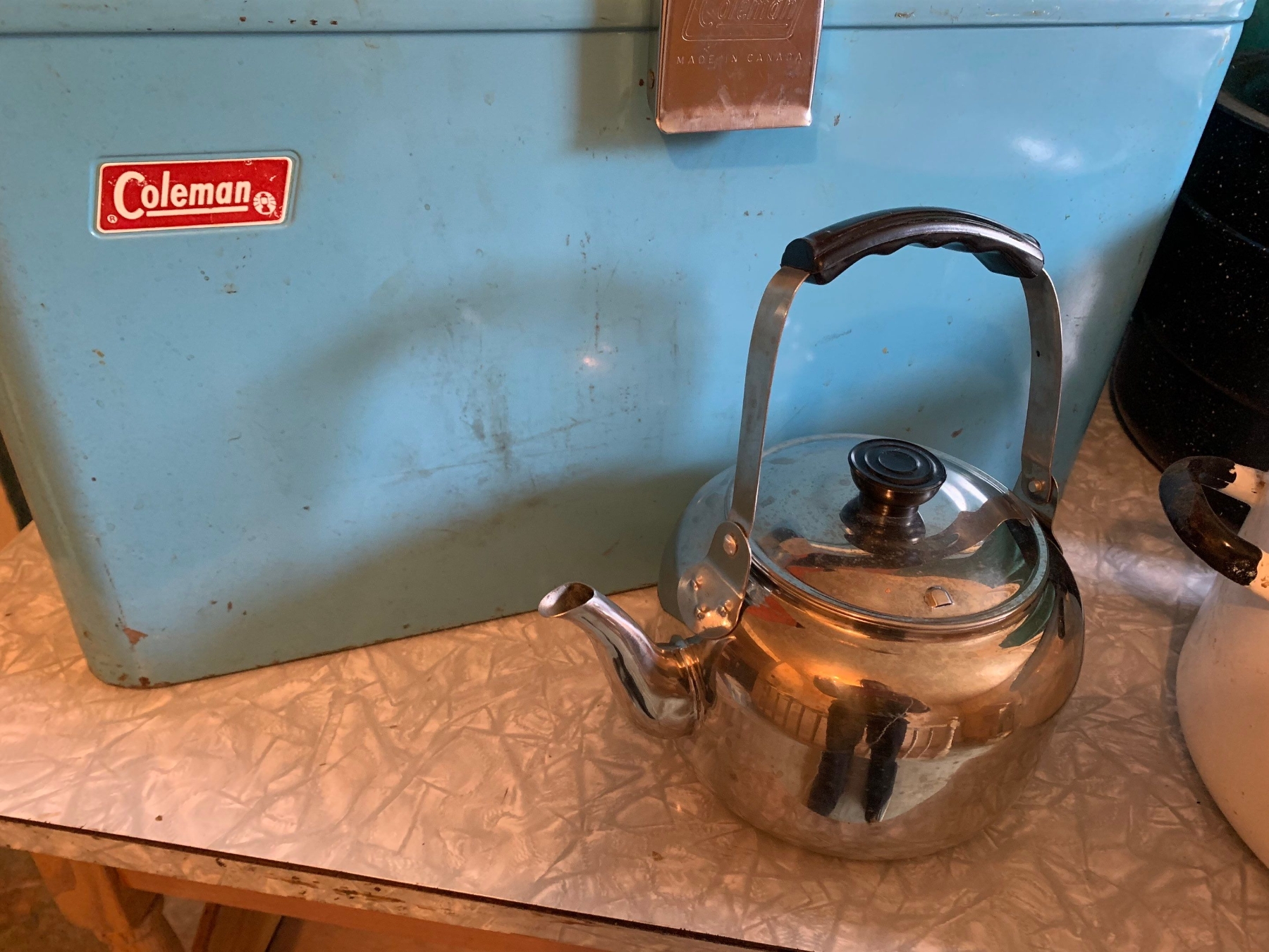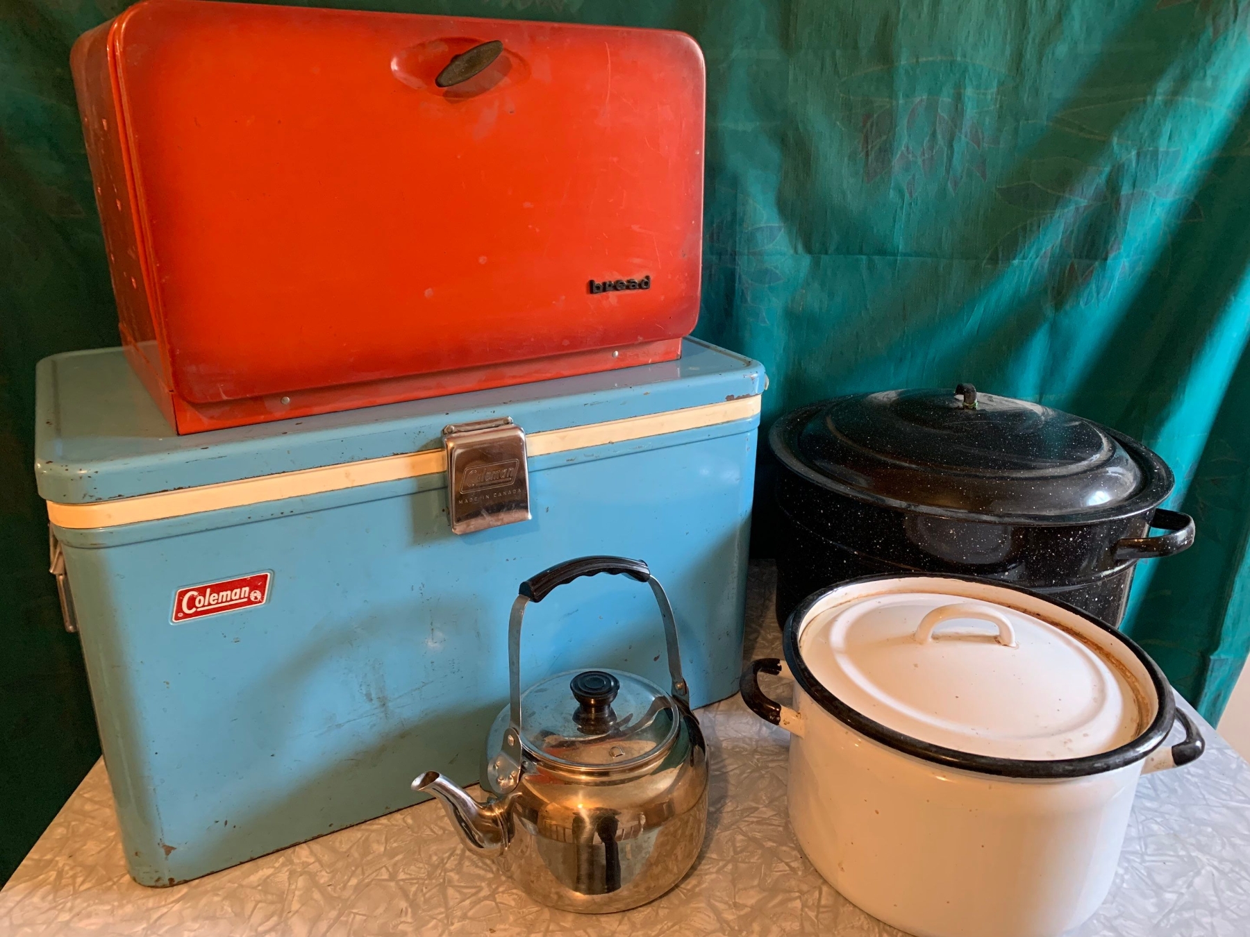 Vintage Coleman Cooler, bread box, tea kettle, enamel pot and canner