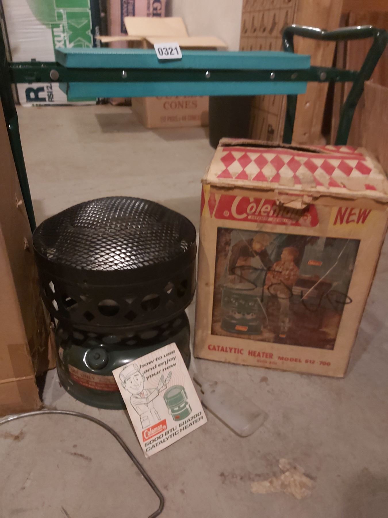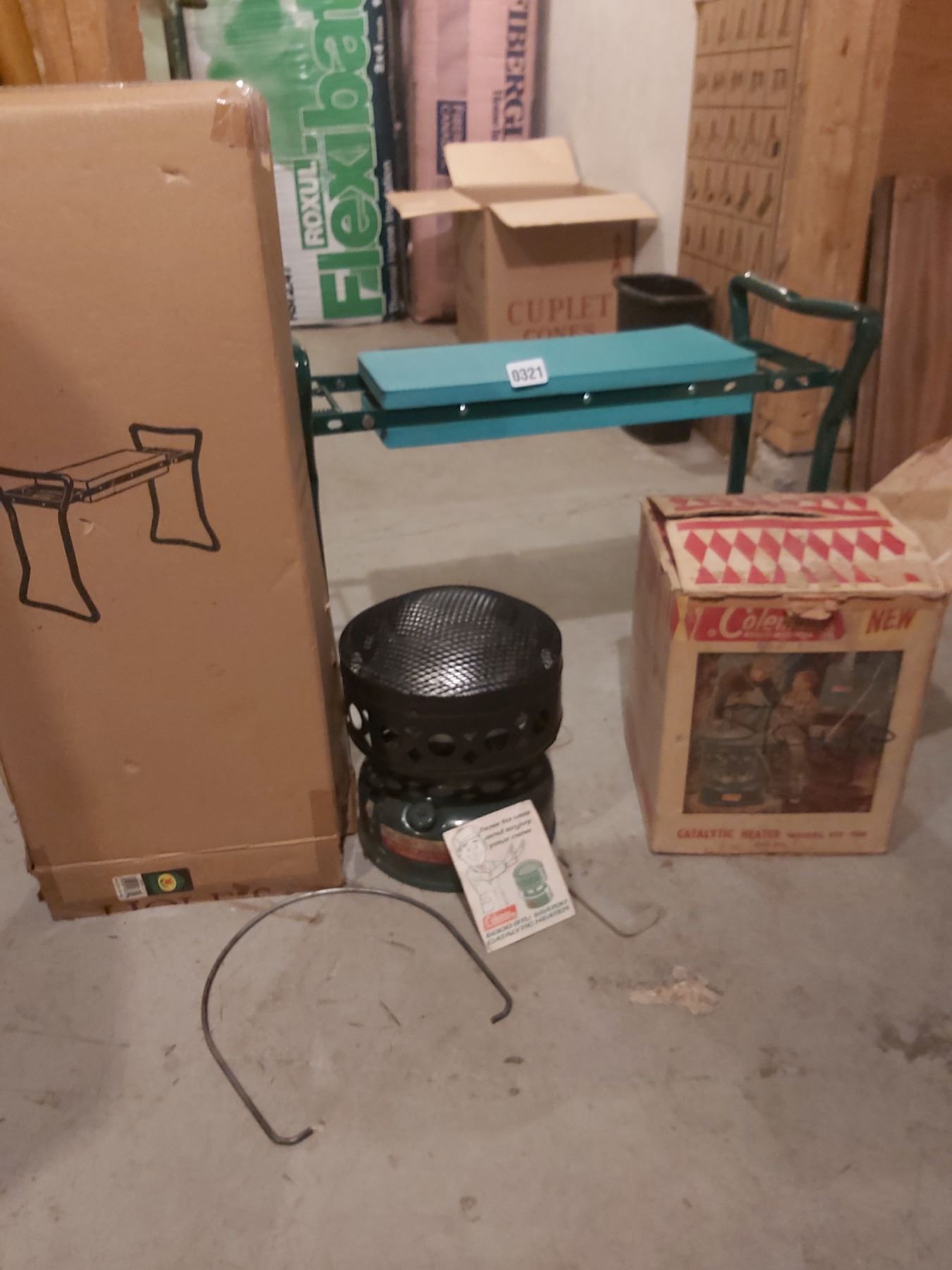 Vintage Coleman catalytic heater (model 512-700), kneeler, stool