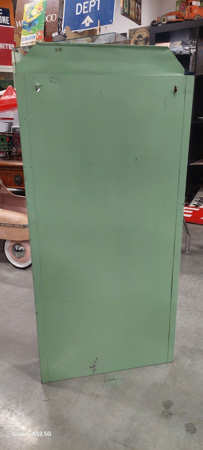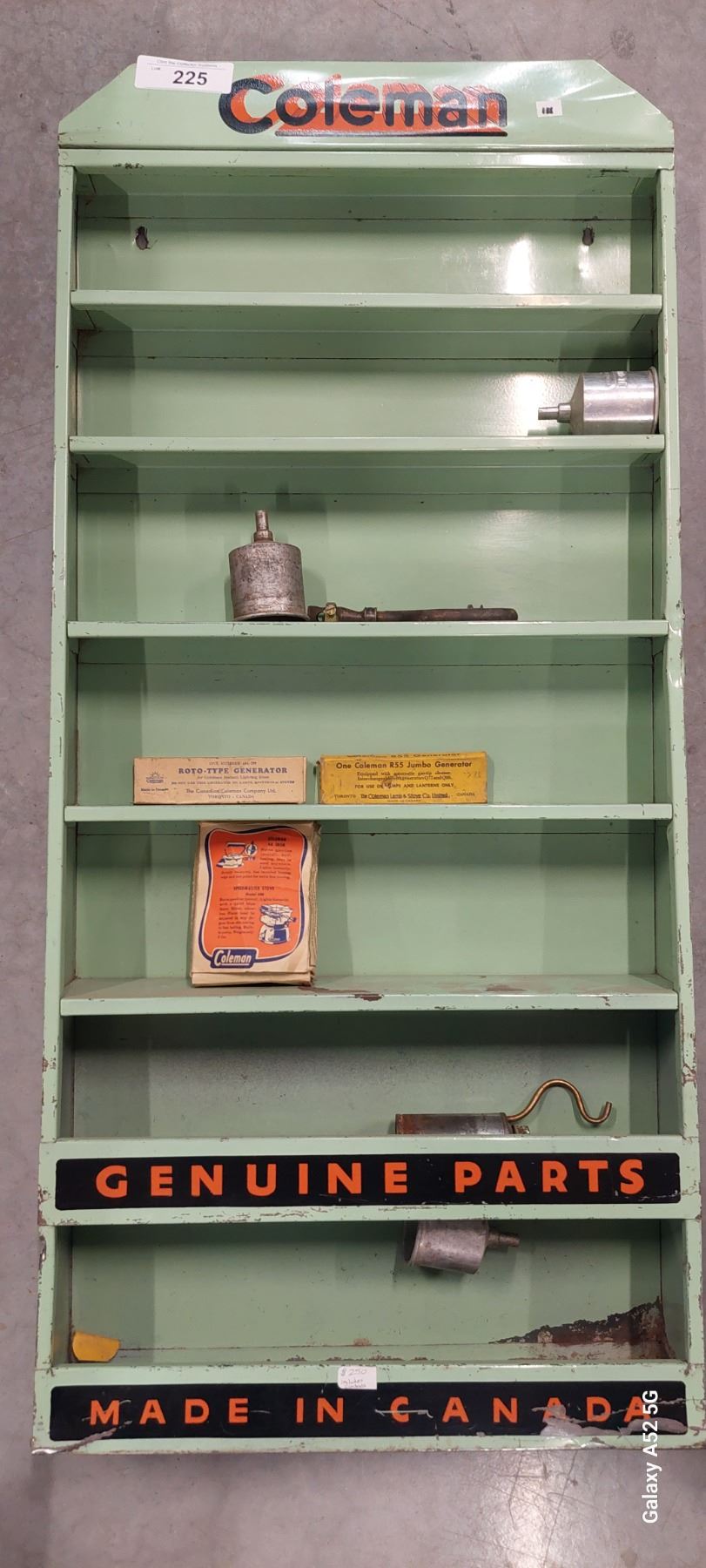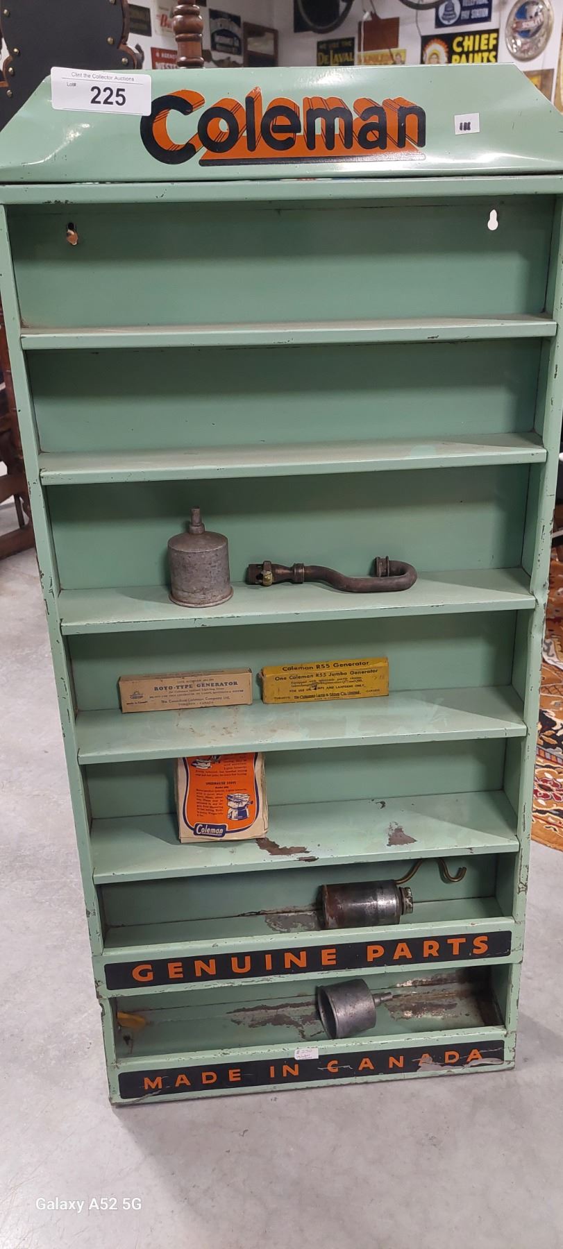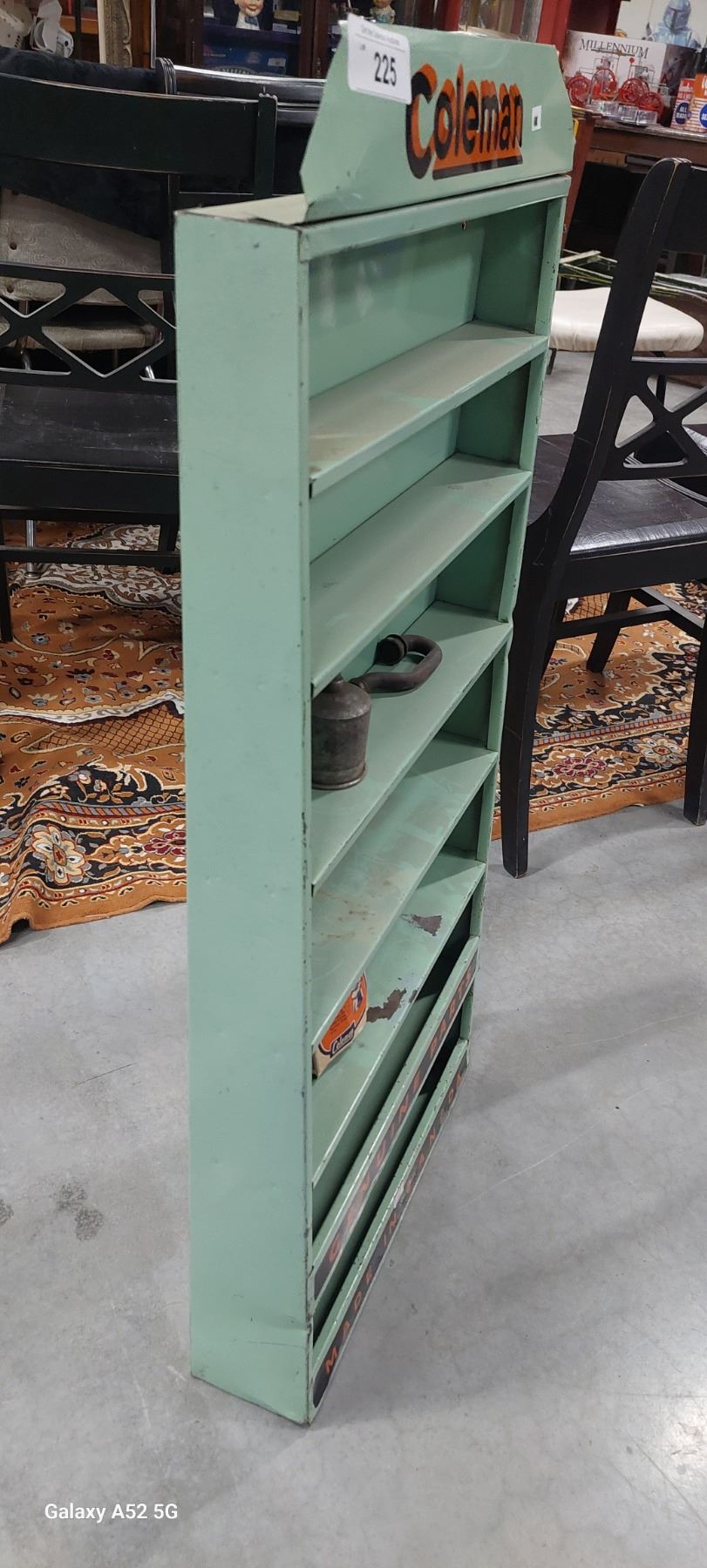 Vintage Coleman metal display rack with contents 37"x18"