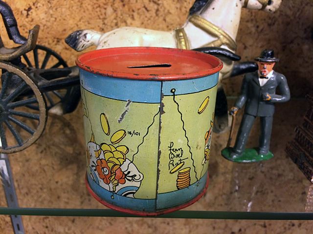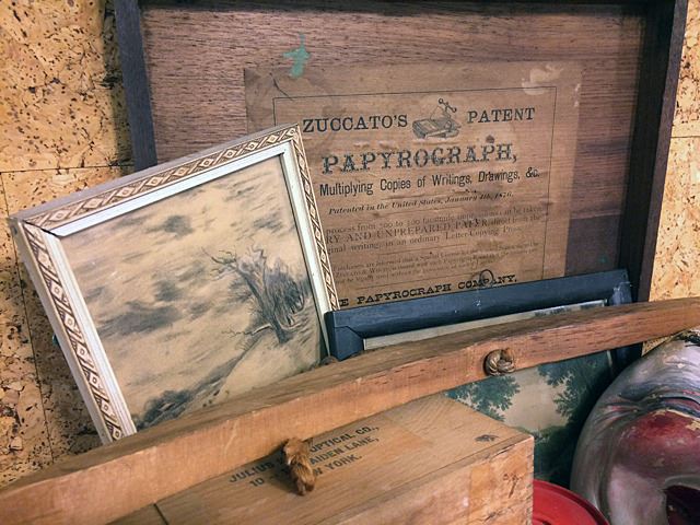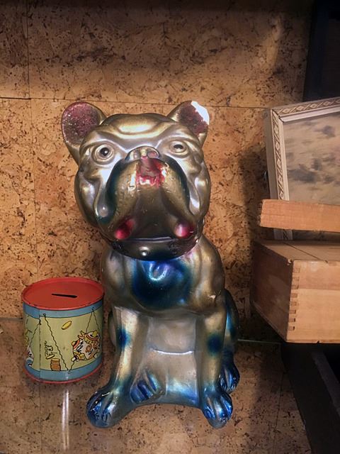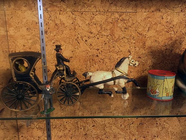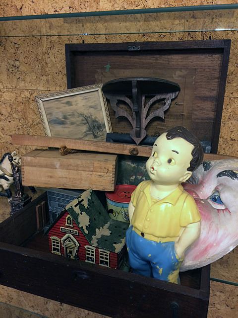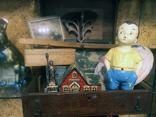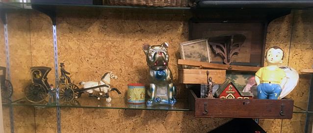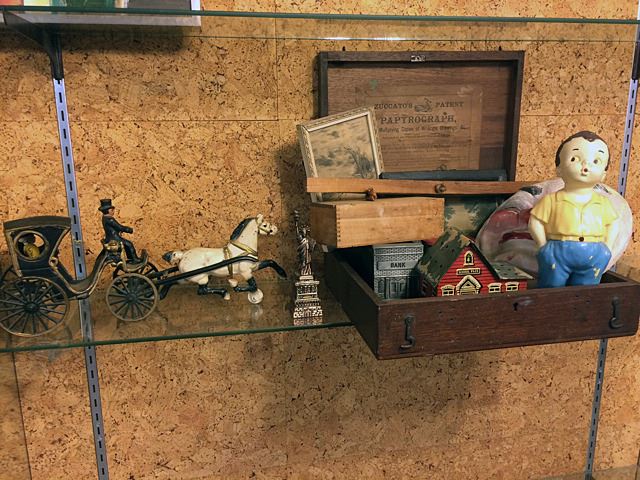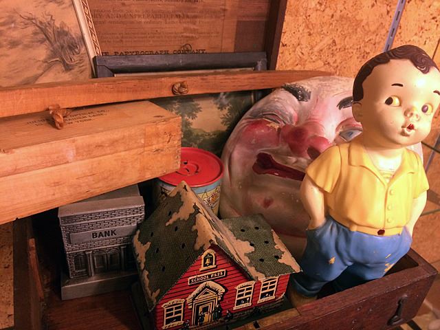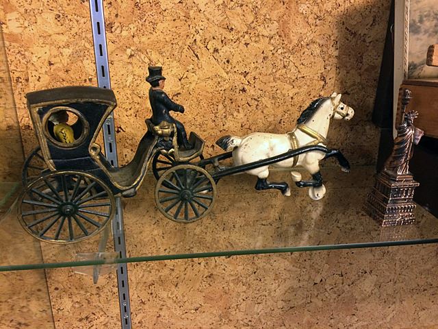 Vintage estate collectables lot includes cast iron horse and carriage, Carnival dog, Statue of Liberty, Papyrograph wooden box, artwork, Carnival clown face, boy doll, vintage tin coin banks, etc. Nice estate collectables lot.