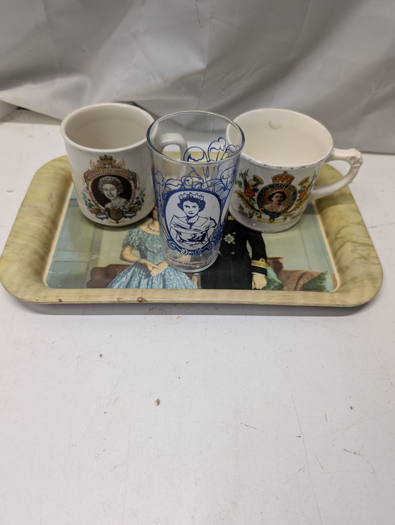 Vintage Collection of Queen Elizabeth the 2nd (Tray, 2 Mugs, Glass cup)