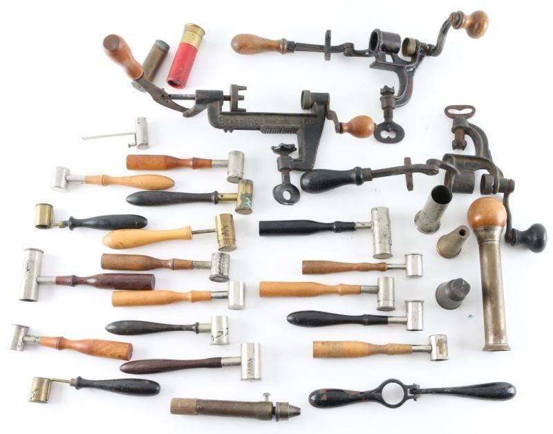 18 which are wood handled powder measures ,3 Vintage reloading tools an more