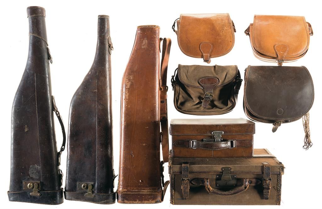 3 mutton cases, lester cartridge box for 8 boxes of shells with "Baron LeVavasseur" hand marked on cover (with 4 empty Chaplin Premier boxes), canvas cartridge box for 400 cartridges, 4 cartridge bags (3 leather, 1 canvas). Overall fair to good.