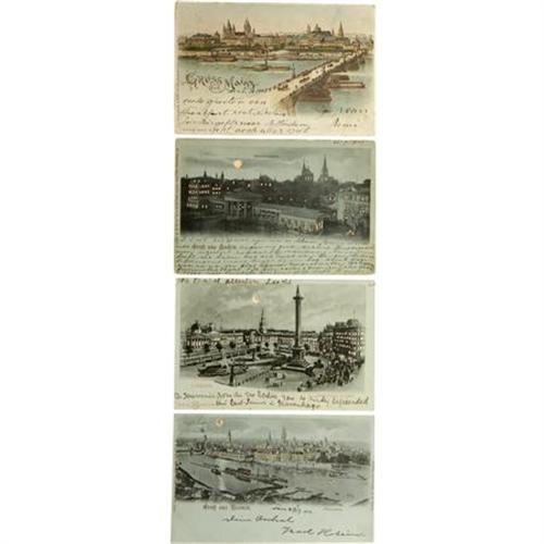 <B>Hold-To-The-Light Color Postcards of European Cities</B></I>. Rare and unique these cards are "Hold to the Light" novelty cards. The group includes twelve postcards circa late 19th century, depicting scenes from some of Europe’s most picturesque cities including Aachen, Mainz, London, Bremen, Zurich and several others. When held in front of a light (hence the name), another scene is exposed hidden within the original scene but only visible when the card is back light. Some of these show a glistening town in the moonlight, others show highlighted buildings. Most of the postcards have been used and have toned slightly with age, else they are all in very good condition. Highly collectible this type of post card is becoming harder to find.<BR><BR><b>Shipping:</b> Flat Material, Small (<a target="_blank" href="http://www.heritageauctions.com/common/shipping.php">view shipping information</a>)