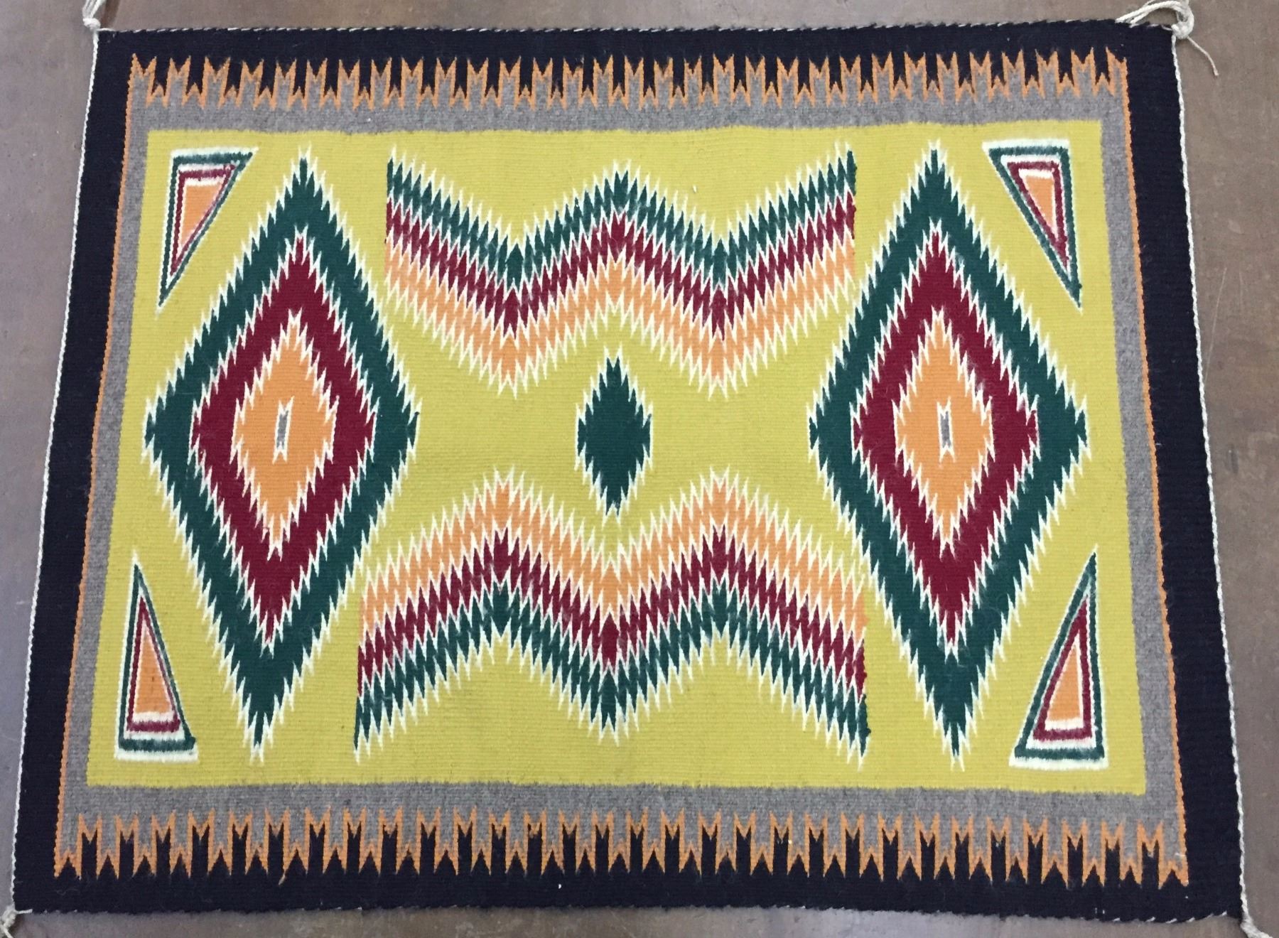 Description: A vintage, colorful, busy pattern Navajo textile. Maker: Unknown Navajo weaver. Approx. Age: Circa 1970s. Size: Measures 35" w x 36" long. Condition: Good for its age, normal wear expected. Please look closely at the pictures - they are an important part of our description. Shipping: There will be a $5 handling / packaging fee for shipping this lot. The actual cost of postage will be added on top of that.