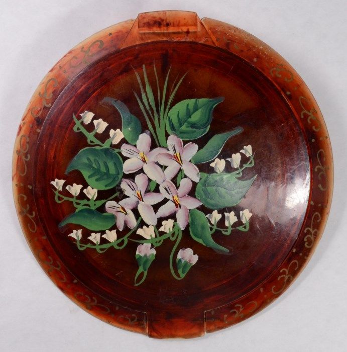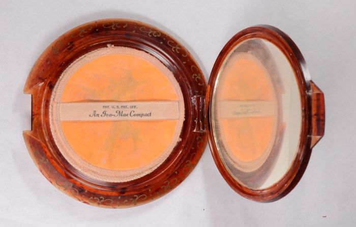 Measures 5.75" in diameter. Looks like tortoise shell colored plastic. Still has original powder puff inside, signed "An Iva-Mae Compact" Est. Value $60-$70