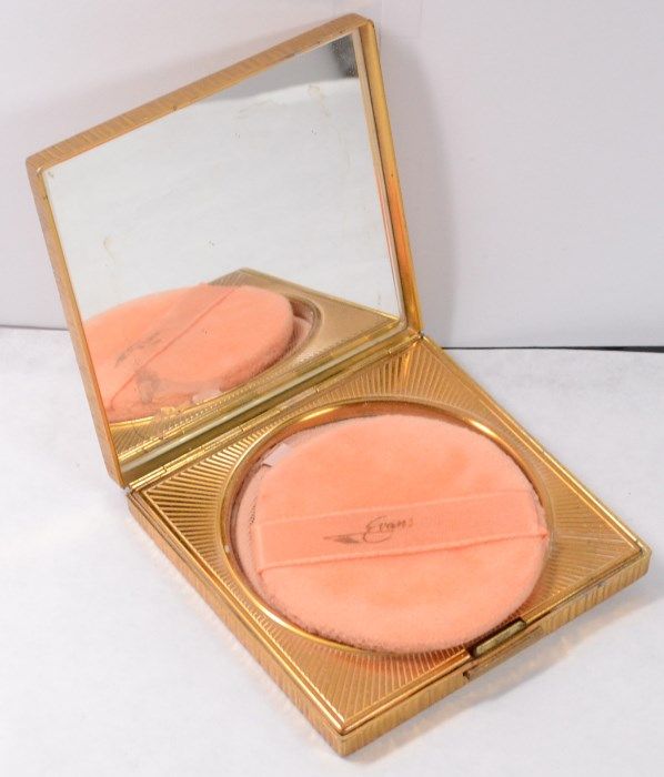Measures 3.25" x 3.25" Has original inner puff, signed Evans in script on the inside. Gold metal. Mirror has minor discolorization. Est. Value $45-$50