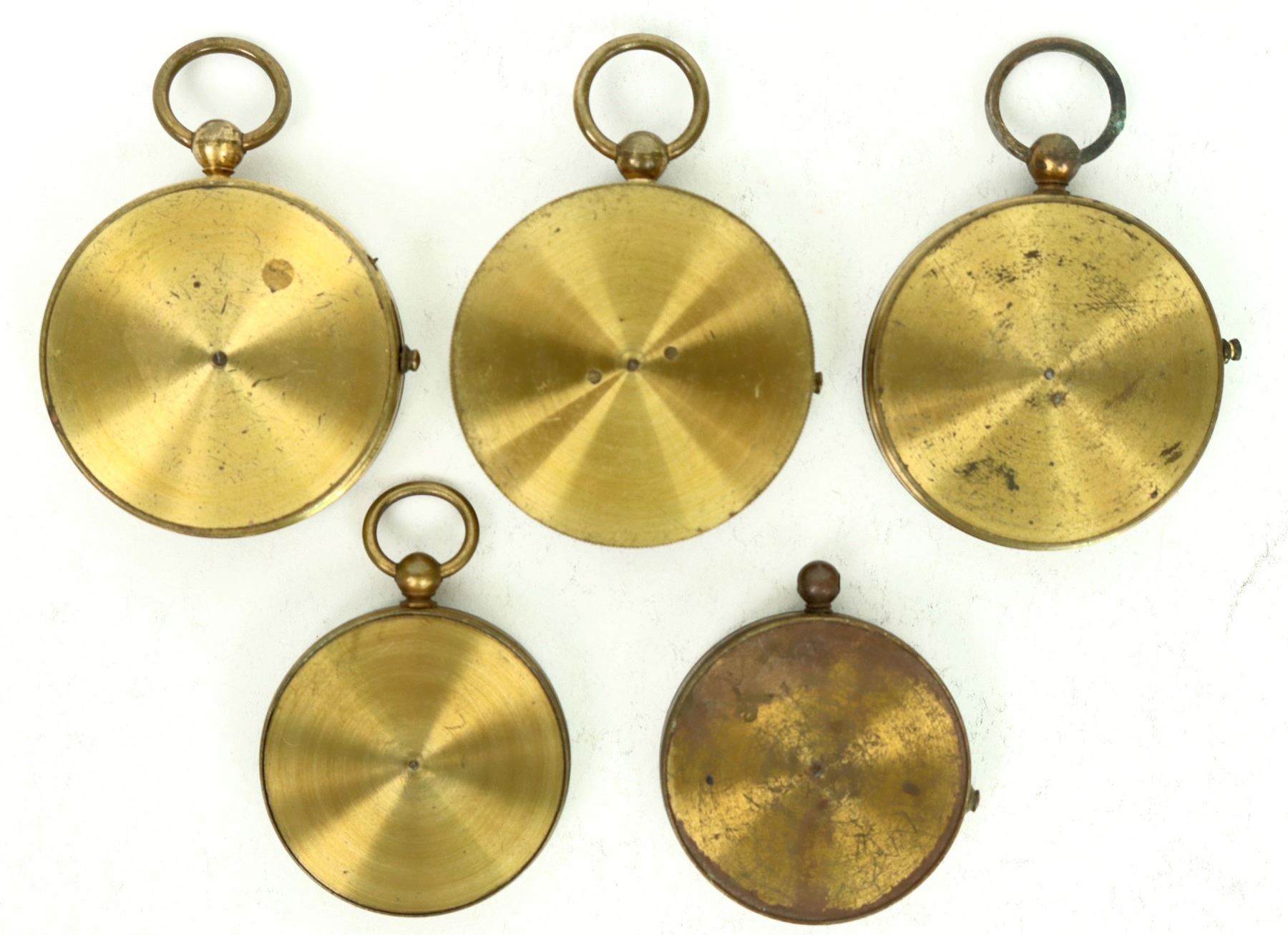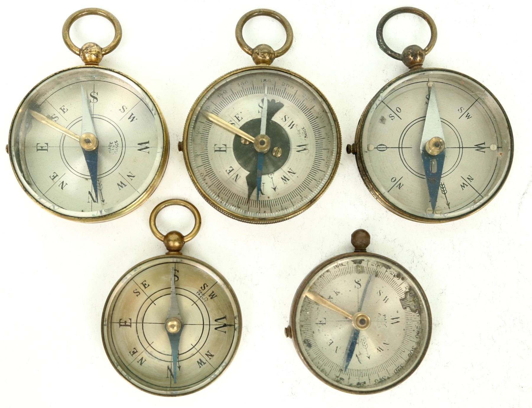 There are five vintage compasses in this lot where four have bail loops. One compass has a second needle to align with your immediate course. All compasses are marked with an inclination to true north with one in particular to 9 degrees west. These are brass framed compasses with bright cards. Quality craftsmanship without makers marks, most are still accurate. 1. 5 in. to 1.75 in. in diameter. Clear lenses. Please see photo for details.