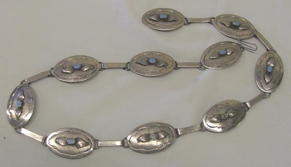 Vintage Concho Belt. Two conchos are missing the stones and the clasp end that attaches to the clasp hook is missing. Measures 30'' end to end. SHI $15.