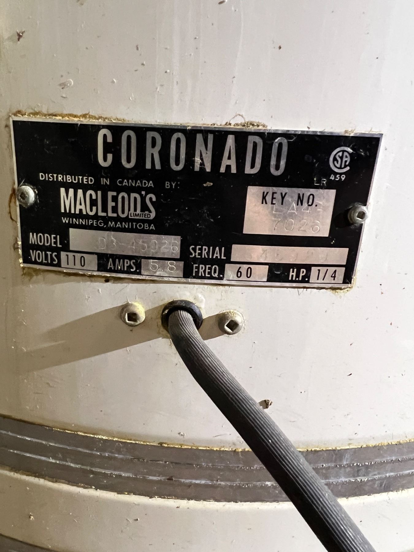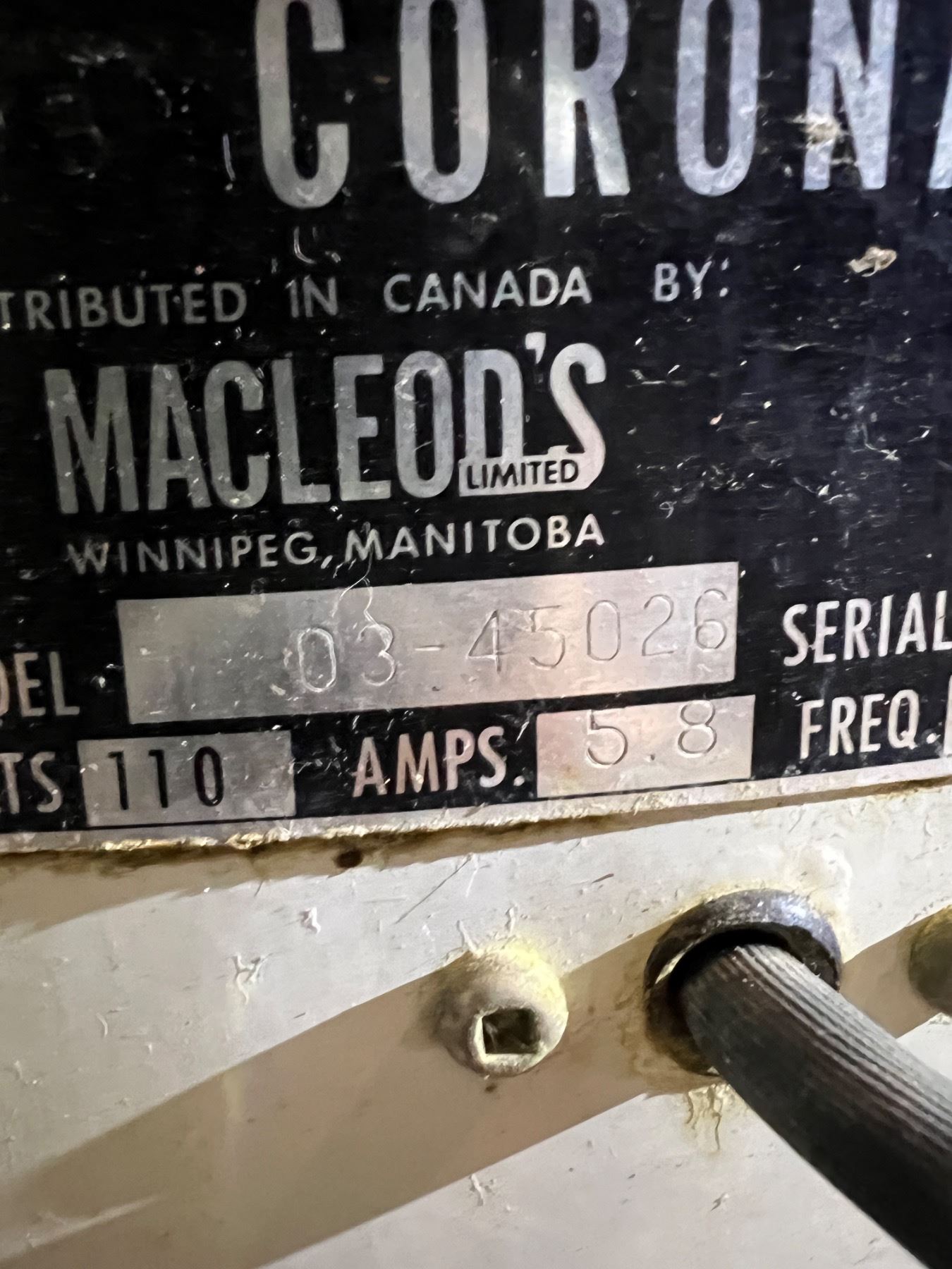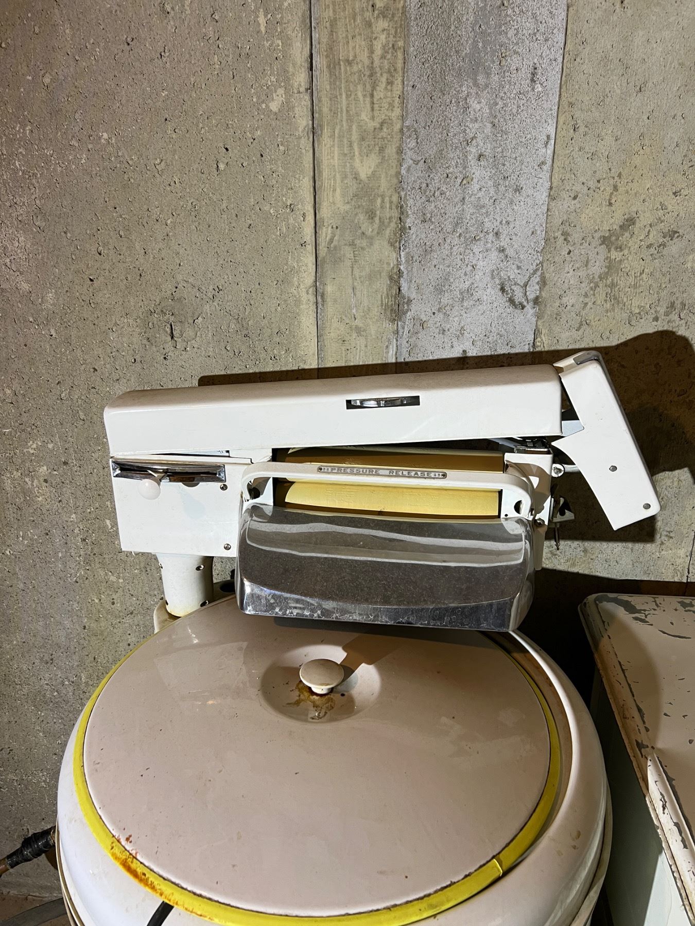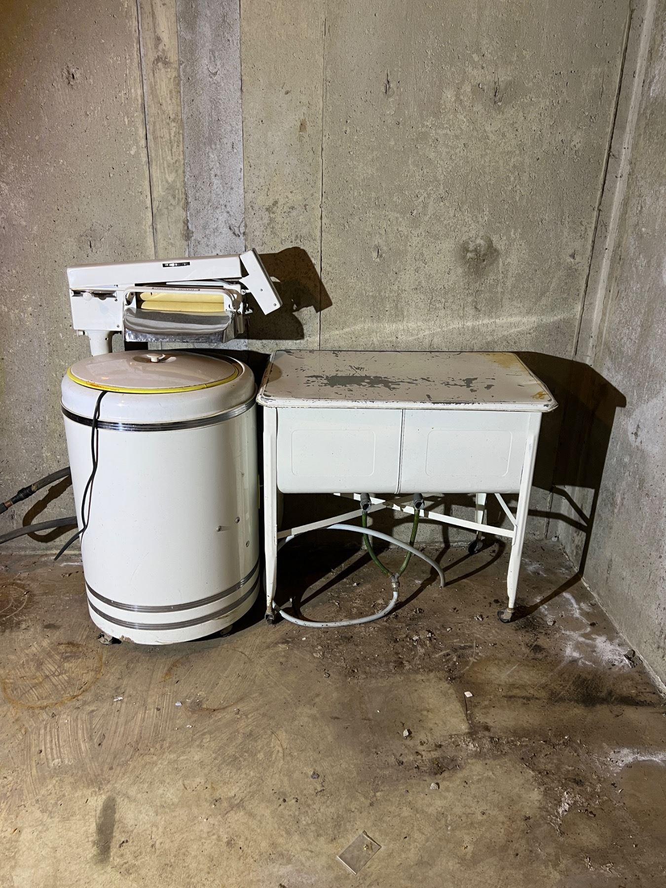 Powers on, can open and close wringer assembly. Water unknown. Measures 45" tall and 24" in diameter. Wash table has a good amount of rust at bottom of one side.