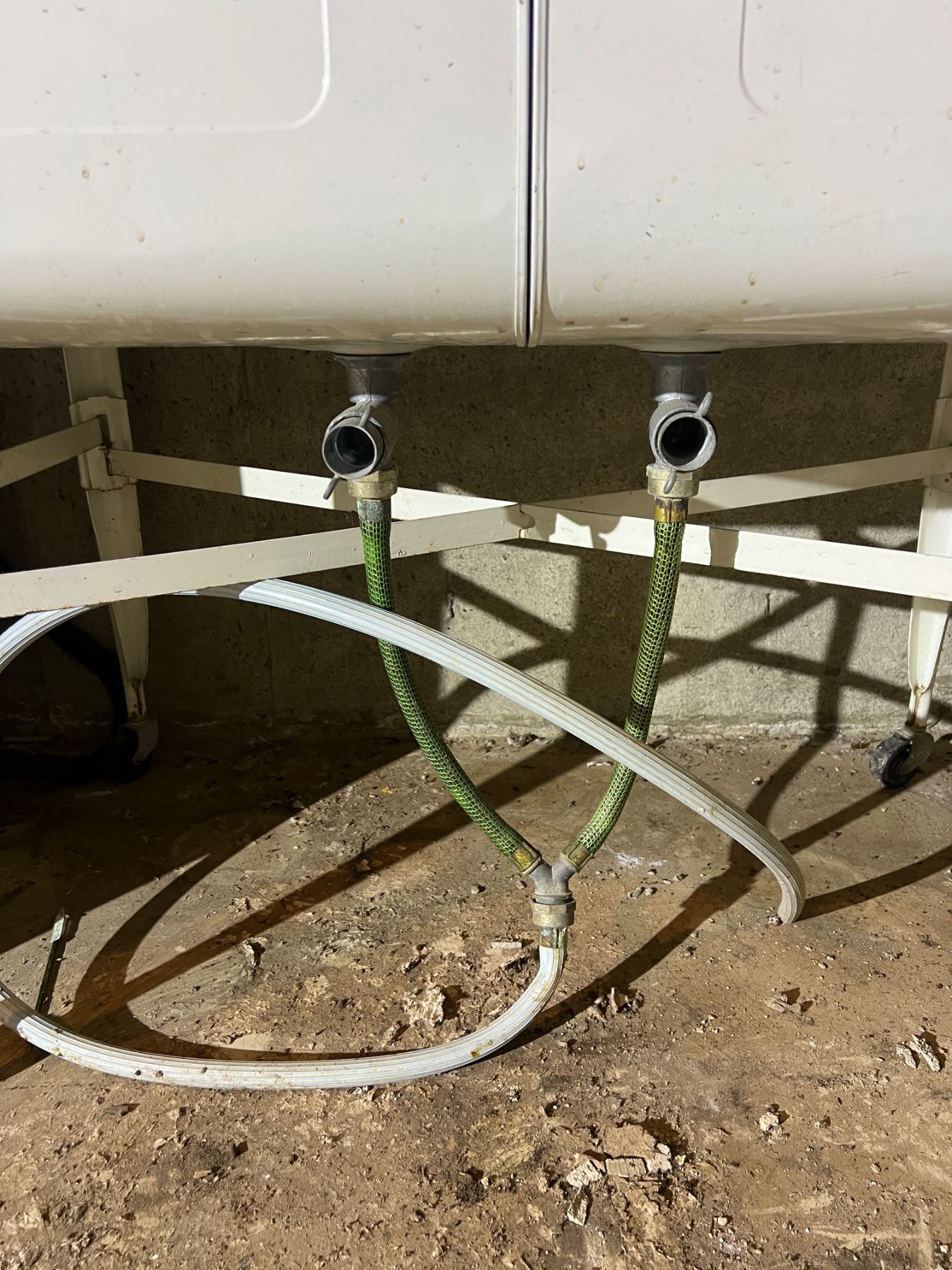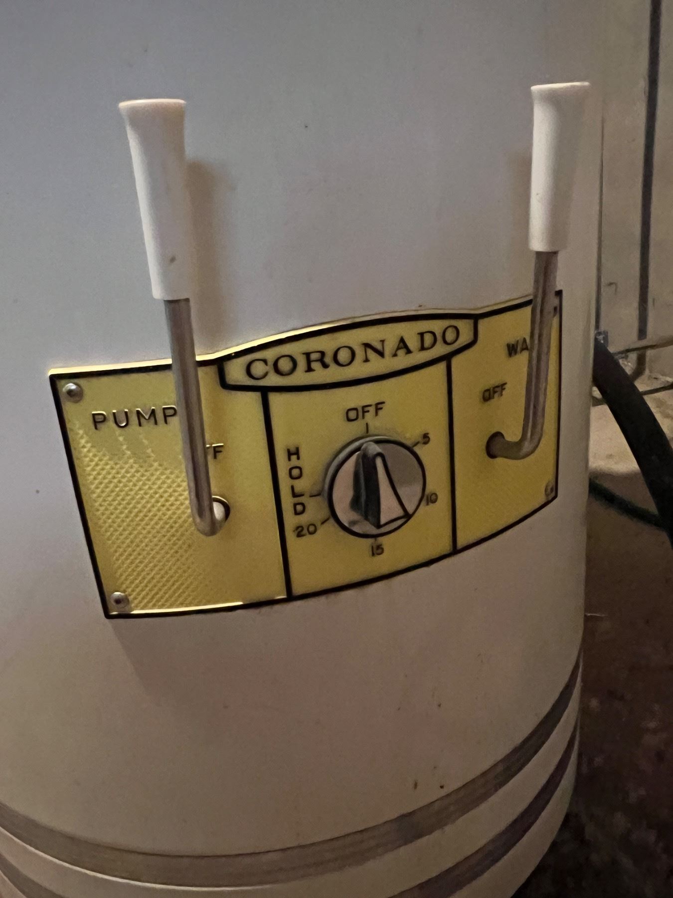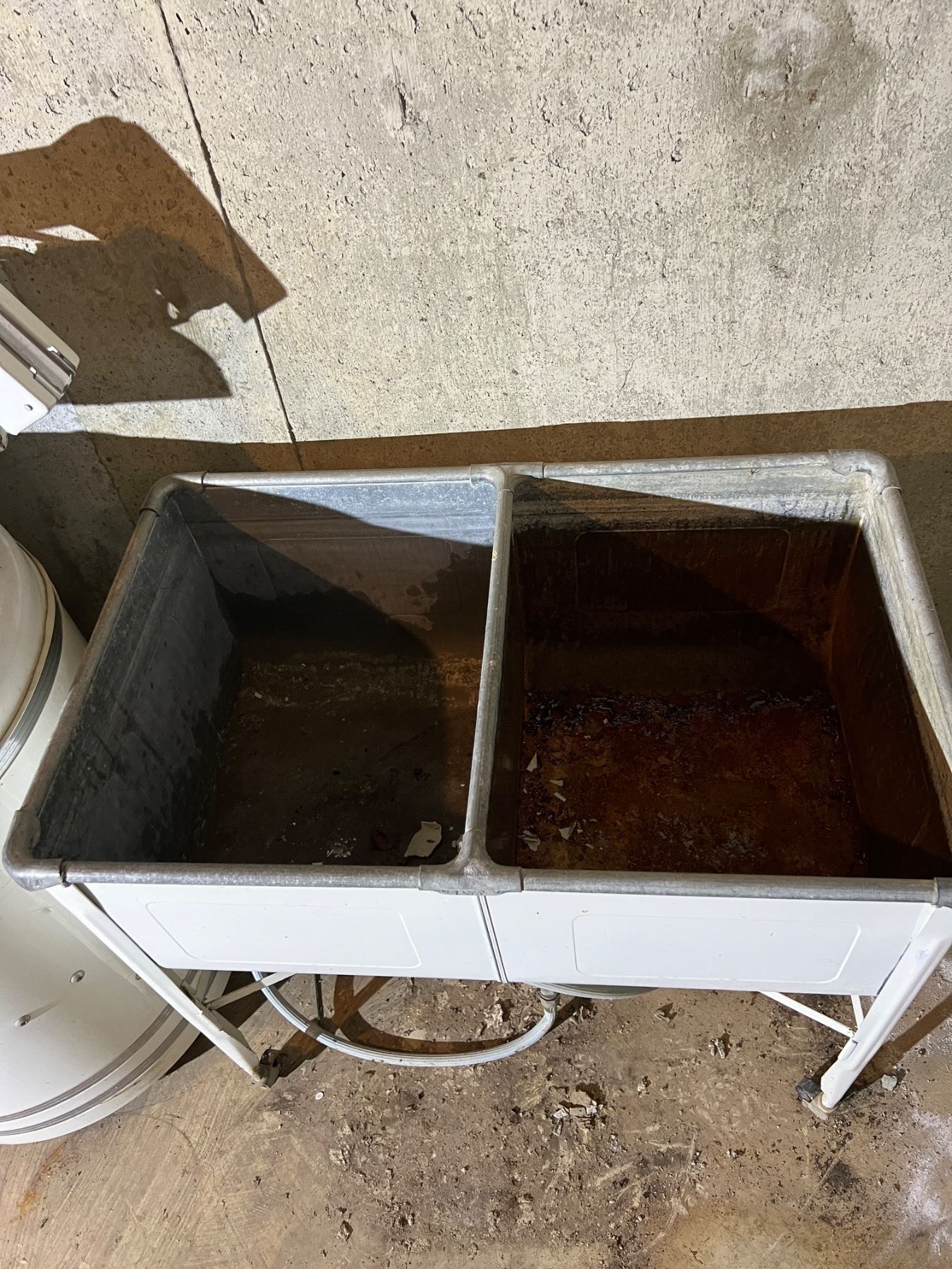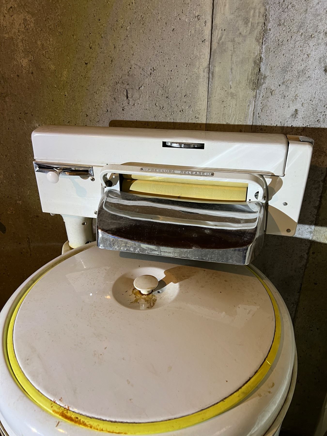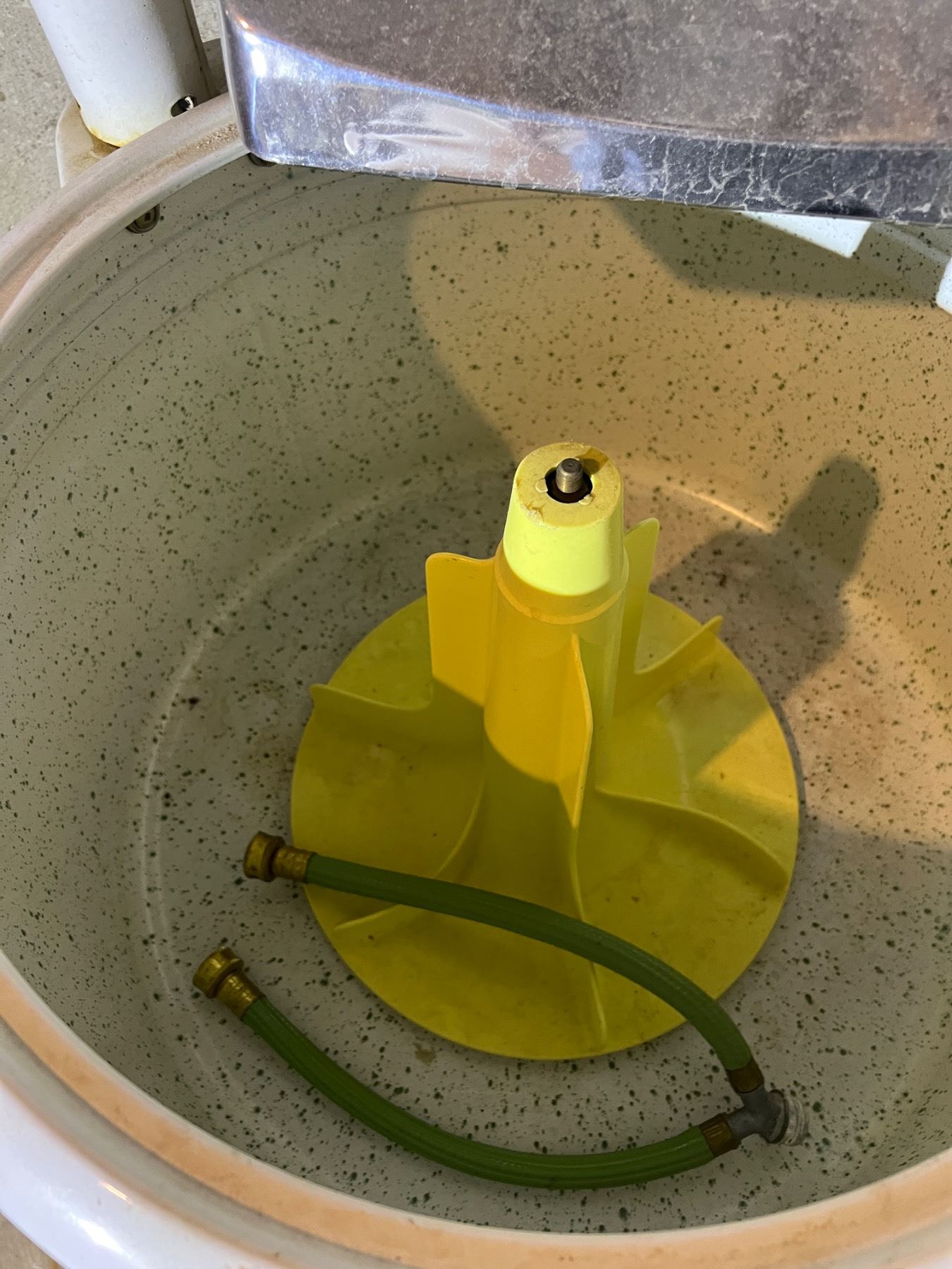 Powers on, can open and close wringer assembly. Water unknown. Measures 45" tall and 24" in diameter. Wash table has a good amount of rust at bottom of one side.