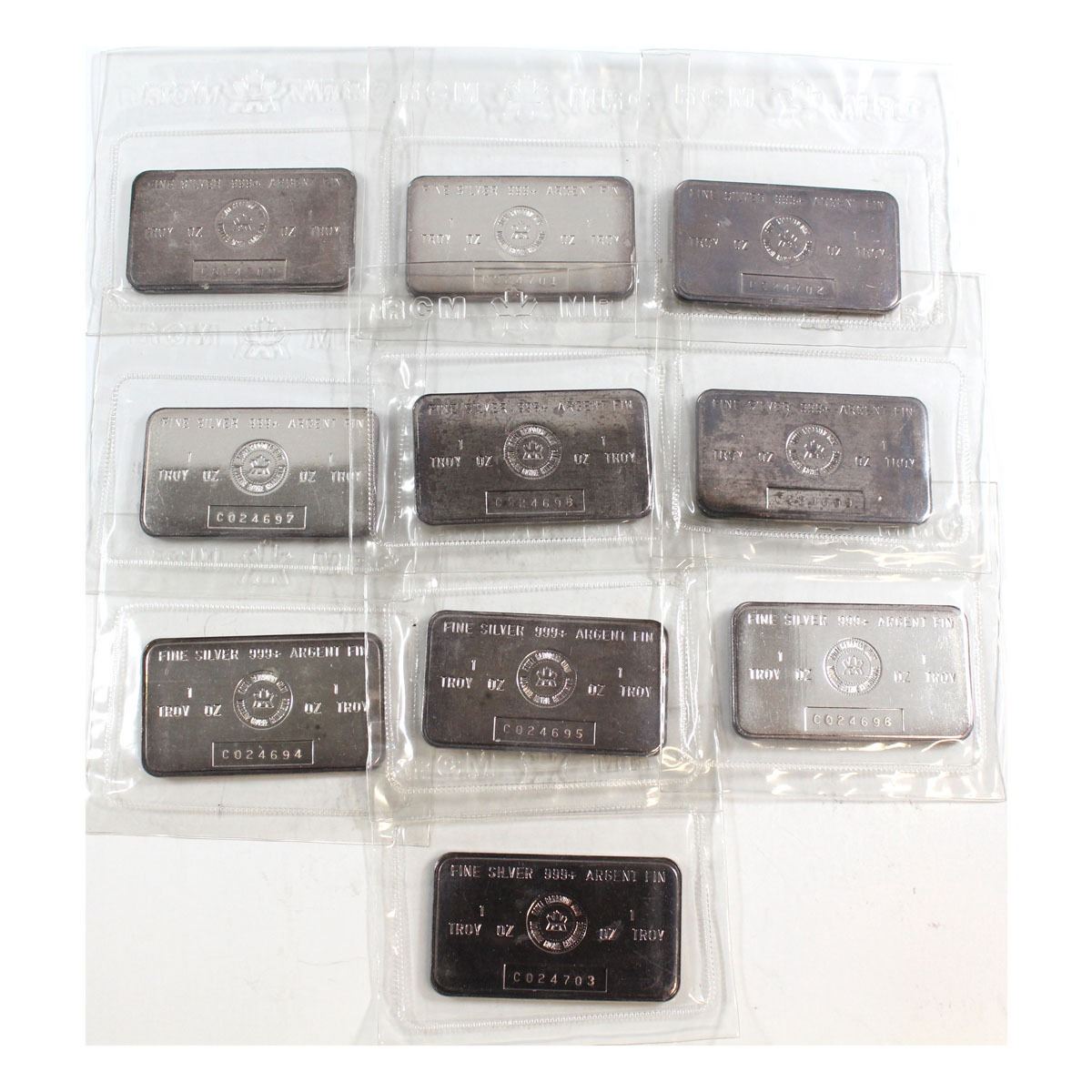 Vintage Consecutive RCM 1oz Fine Silver Bars in original RCM Packaging (TAX Exempt). You will receive serial #'s C024694 to C024703. 10pcs.