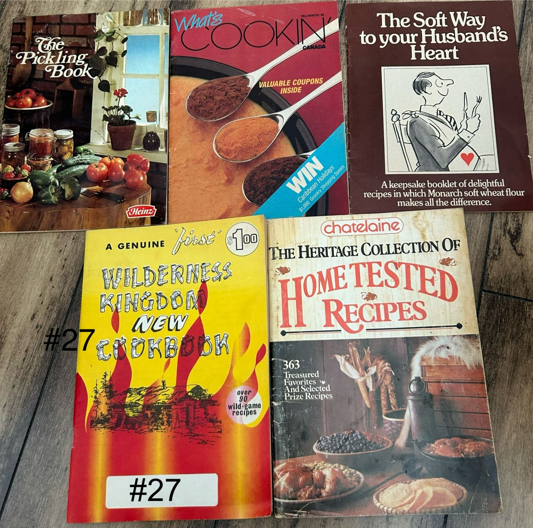 Vintage Cookbooks - Heinz The Pickling book, What's cooking 1985, Monarch The soft way to your Husbands Heart, Chatelaine Heritage Collection, Wilderness Kingdom 1972, Wild game Recipes