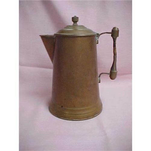 Nice Old Copper Coffee Pot. Pot measures 10?h x 8?w, base is 6? d. It has an attached hinged lid, and a natural wood handle. There are no identifying marks, but it is good condition.