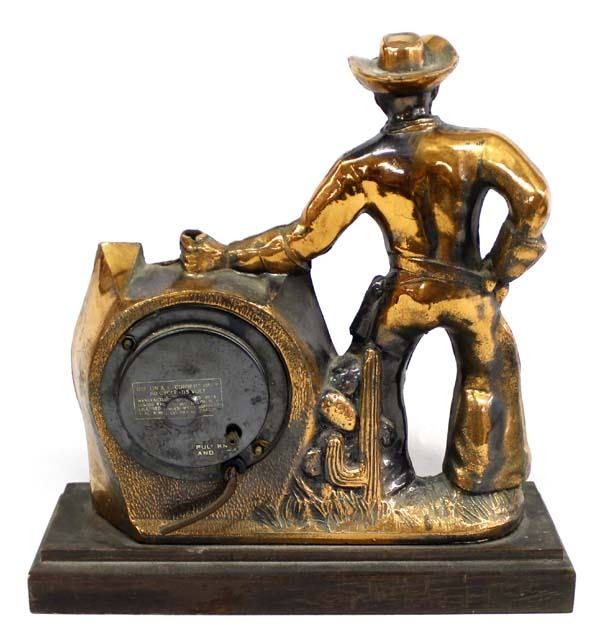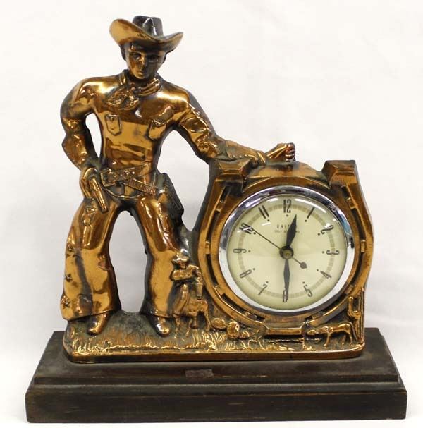 Vintage Copper Cowboy Clock on Wood Base, has a United Self Starting Clock by United Metal Goods Mfg. Co., Inc., Brooklyn, NY, measures 11'' x 11'', he is missing his wire lasso, needs new cord