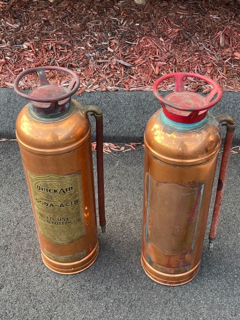 Vintage Copper Quick Aid Soda Acid Fire Extinguishers 2 . These are from a collection from a former Fire Chief of Unionville, CT