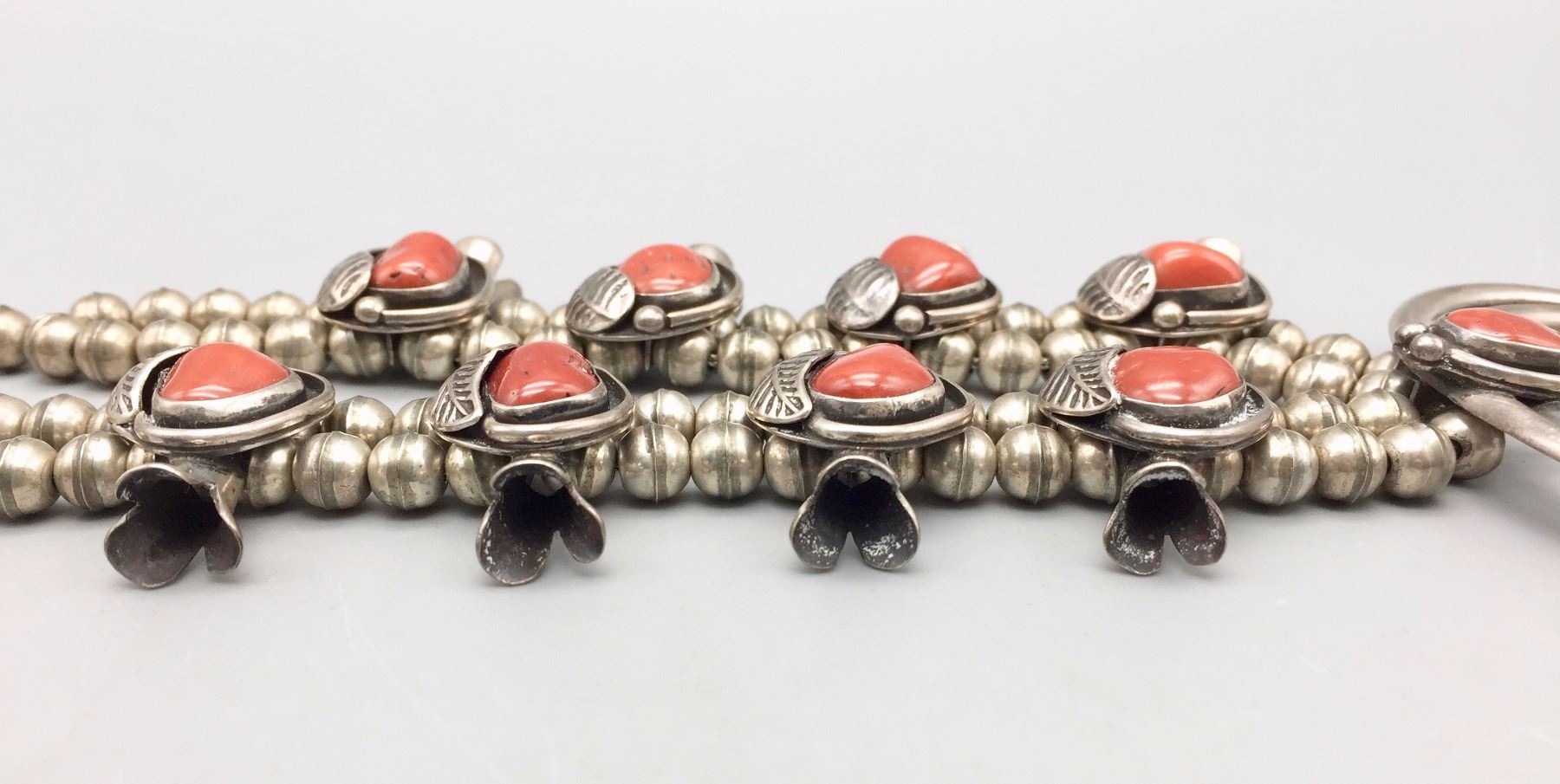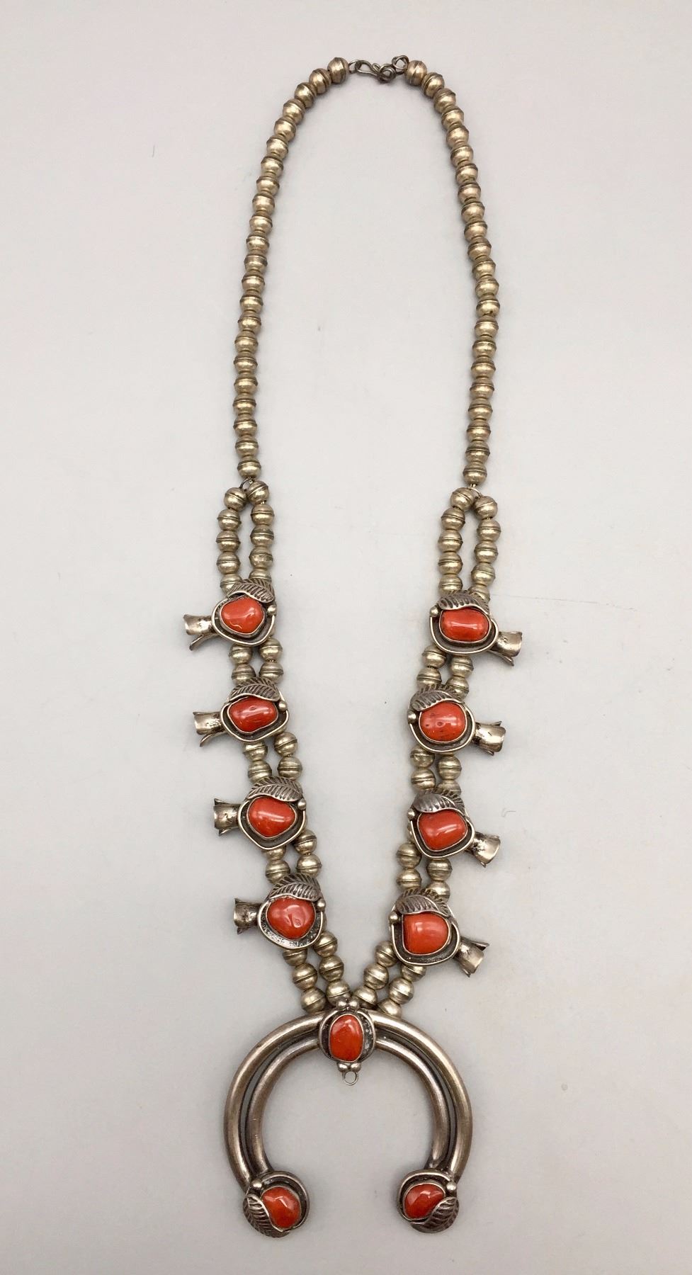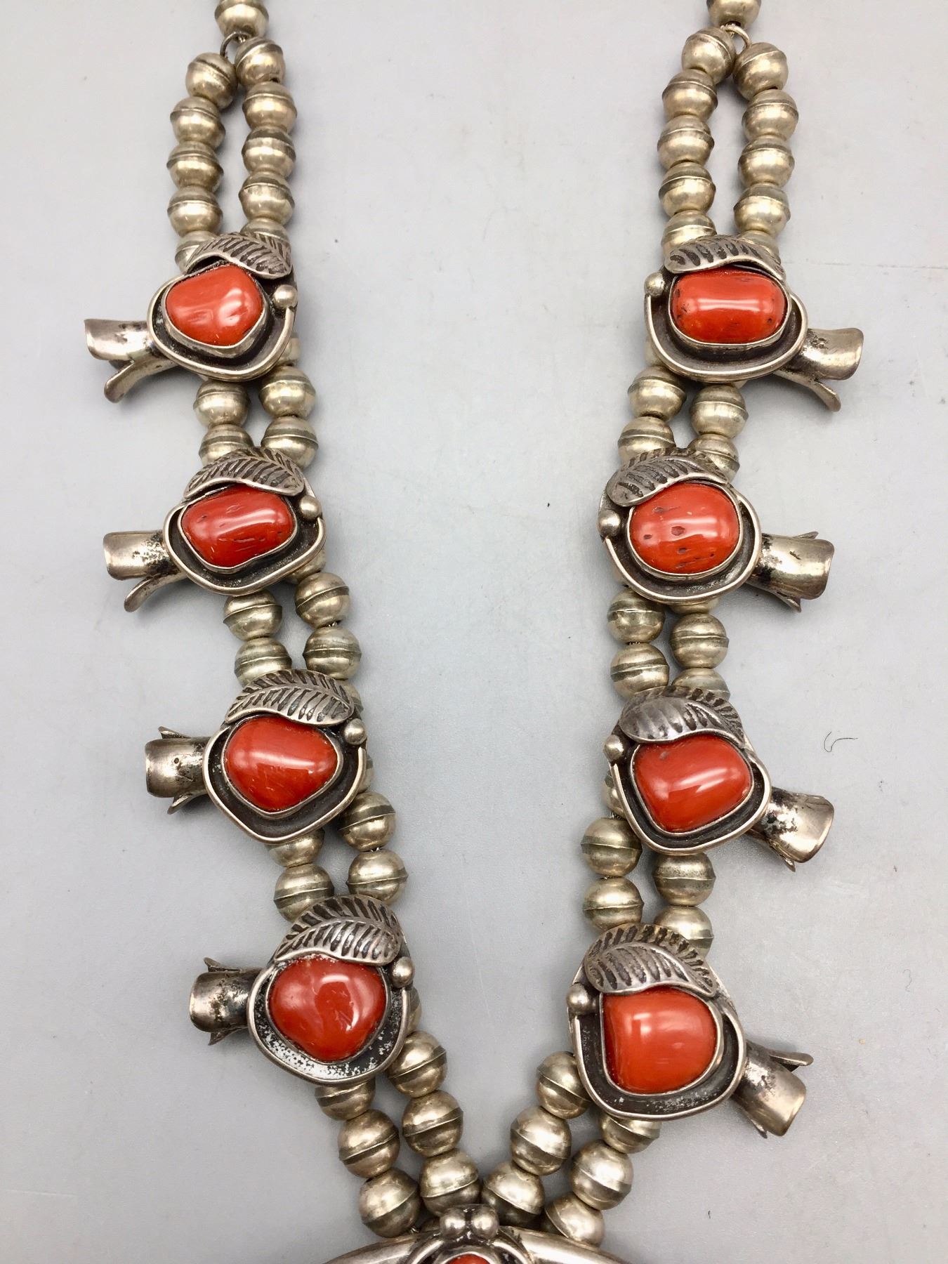 Description: Vintage coral squash blossom. Sterling silver. Maker: Unknown. Approx. Age: Vintage, circa 1970s. Size: 2” around the neck and naja pendant measure 2” l x 2 1/4” w. Weighs 82.8 g. Condition: Good for its age, normal wear expected. Please look closely at the pictures - they are an important part of our description. Shipping: There will be a $5 handling / packaging fee for shipping this lot. The actual cost of postage will be added on top of that.