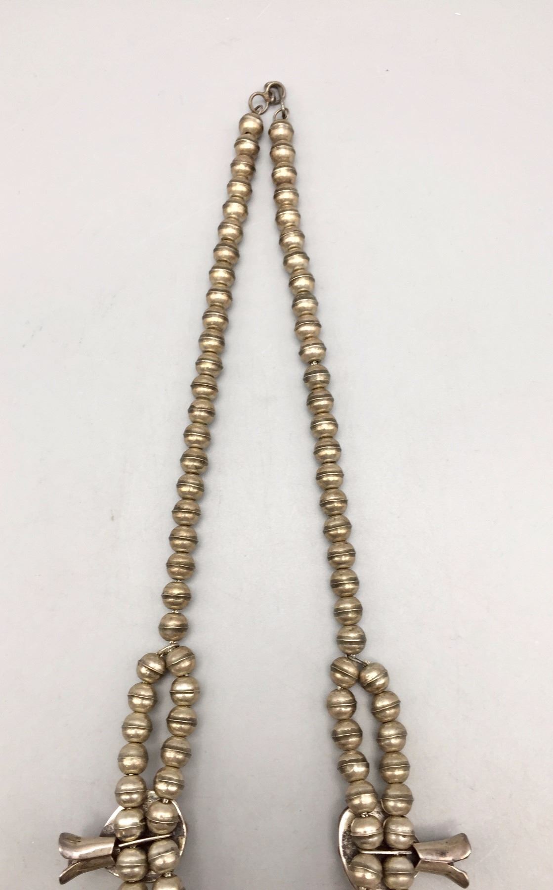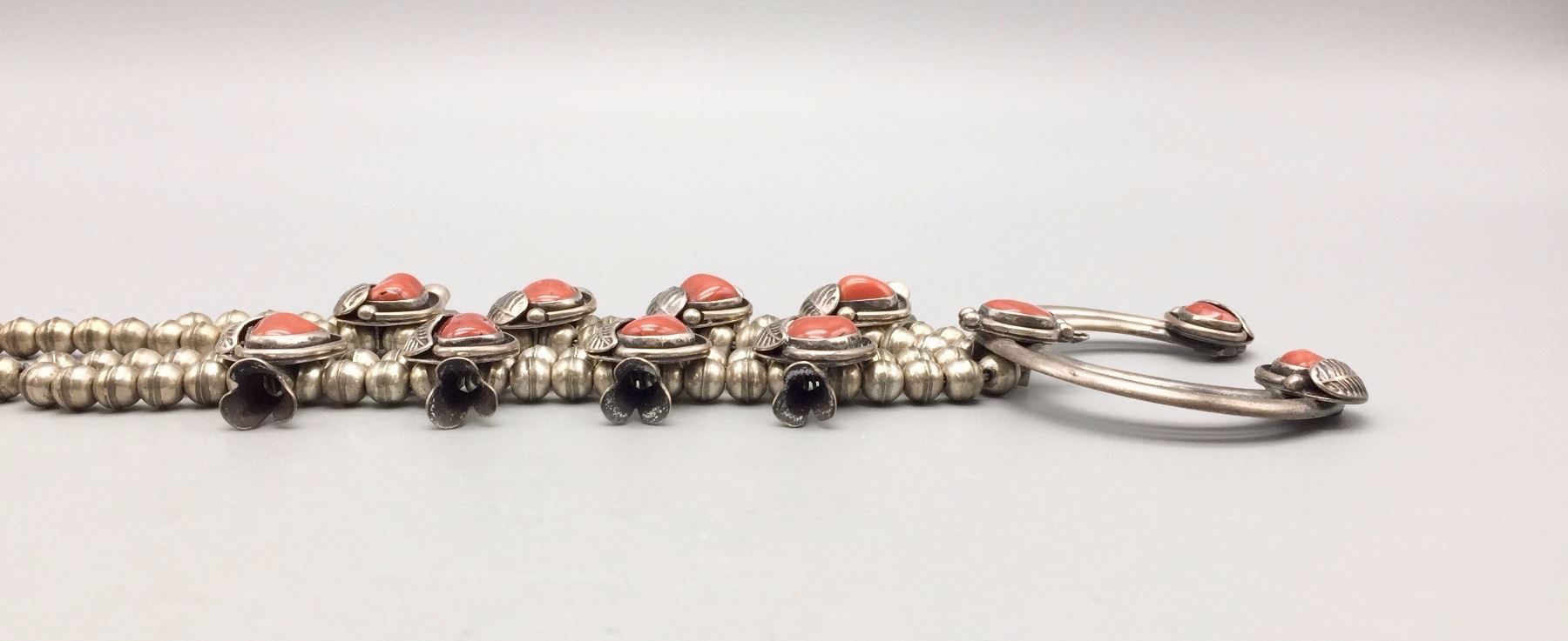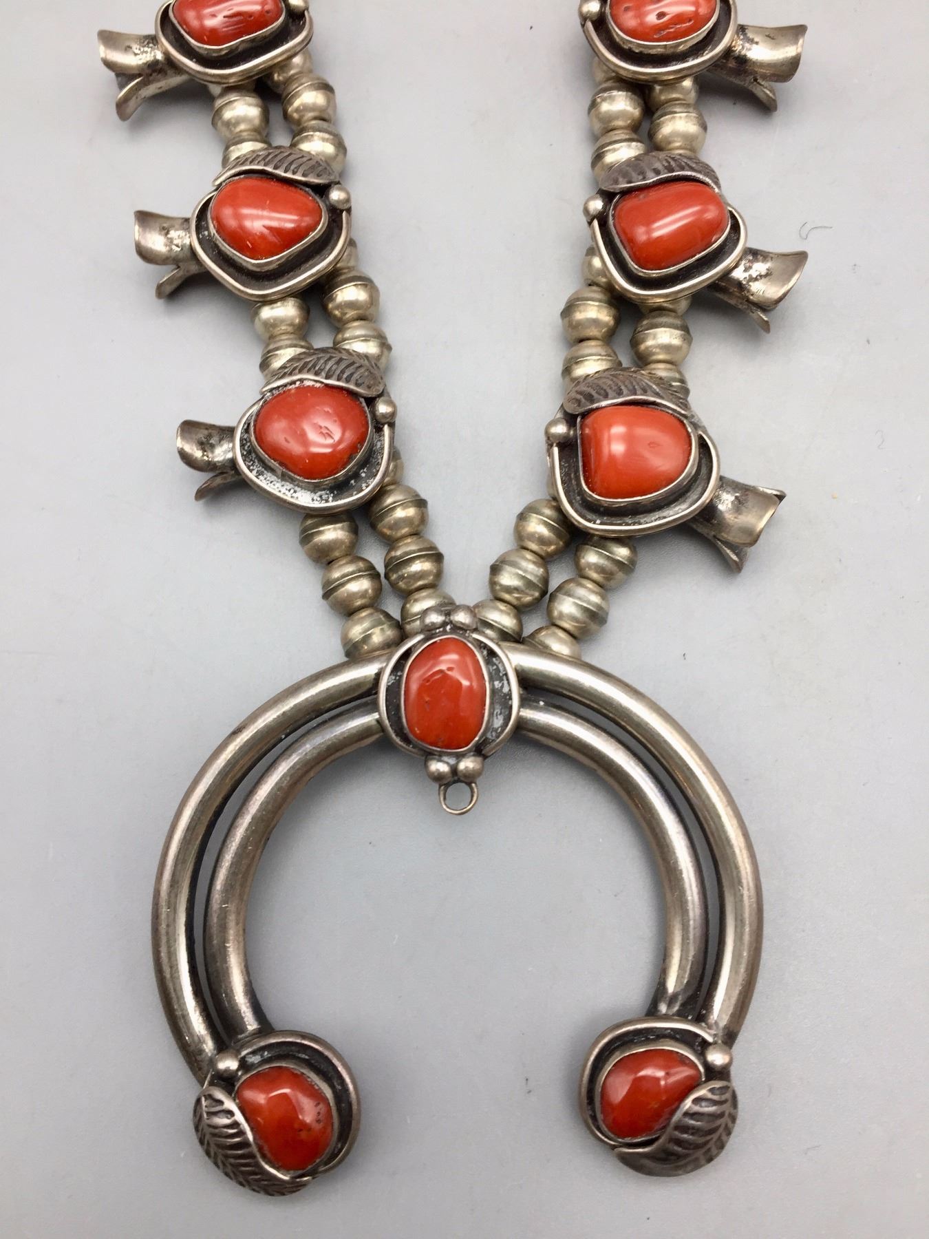 Description: Vintage coral squash blossom. Sterling silver. Maker: Unknown. Approx. Age: Vintage, circa 1970s. Size: 2” around the neck and naja pendant measure 2” l x 2 1/4” w. Weighs 82.8 g. Condition: Good for its age, normal wear expected. Please look closely at the pictures - they are an important part of our description. Shipping: There will be a $5 handling / packaging fee for shipping this lot. The actual cost of postage will be added on top of that.