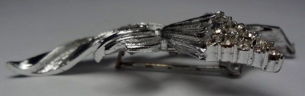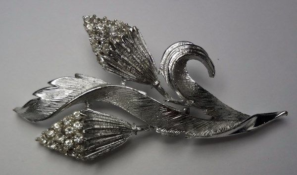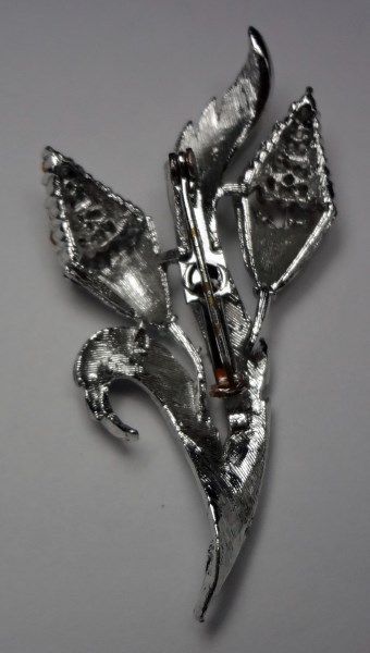 Vintage Corn-Stalk-Like Phinestone Brooch with Leaves Silver tone metal.