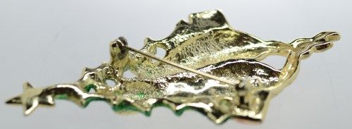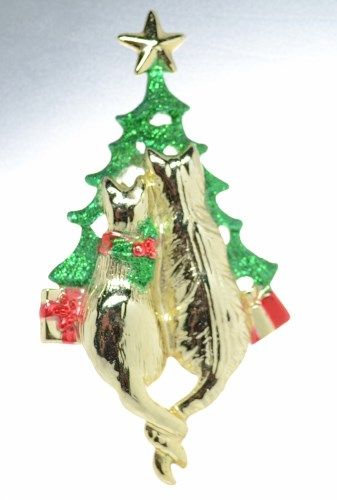 Vintage Coro signed brooch of two cats in front of a Christmas tree.