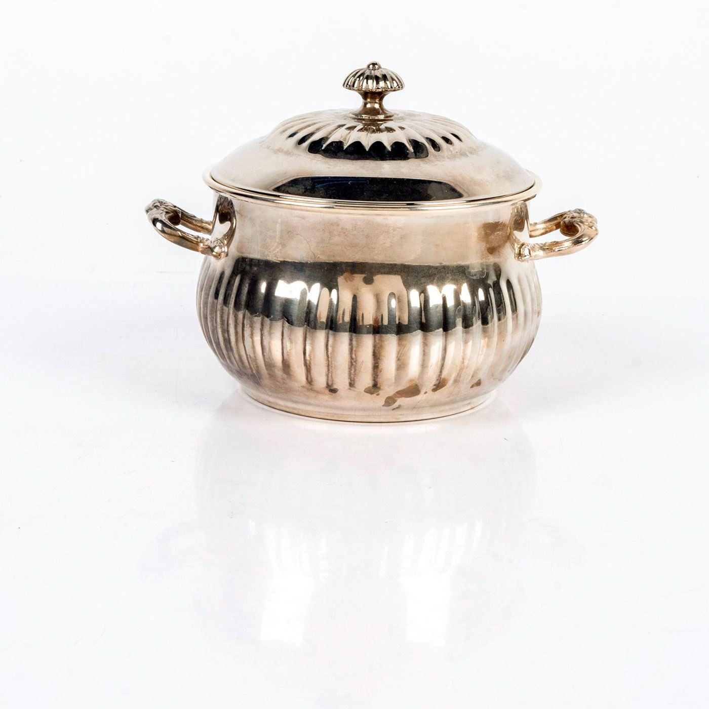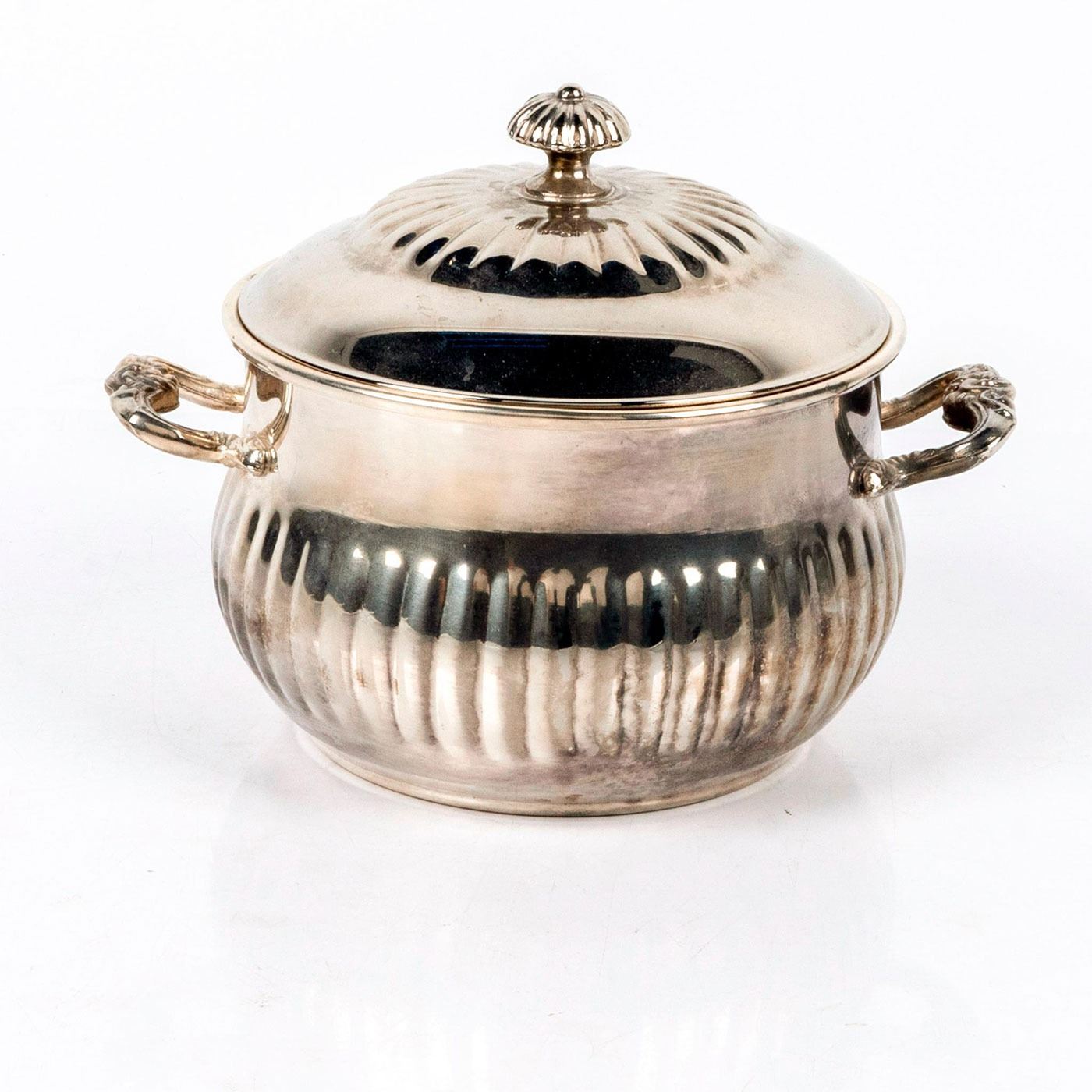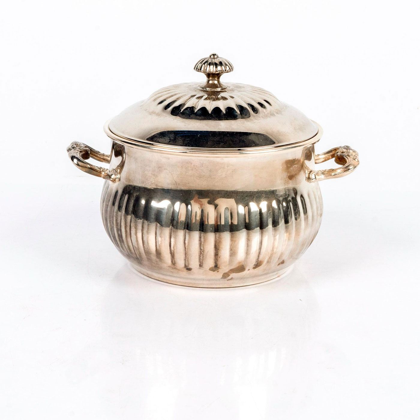 Made from silver plate with ornate handles. Ridged pattern on base and lid. Discoloration throughout.