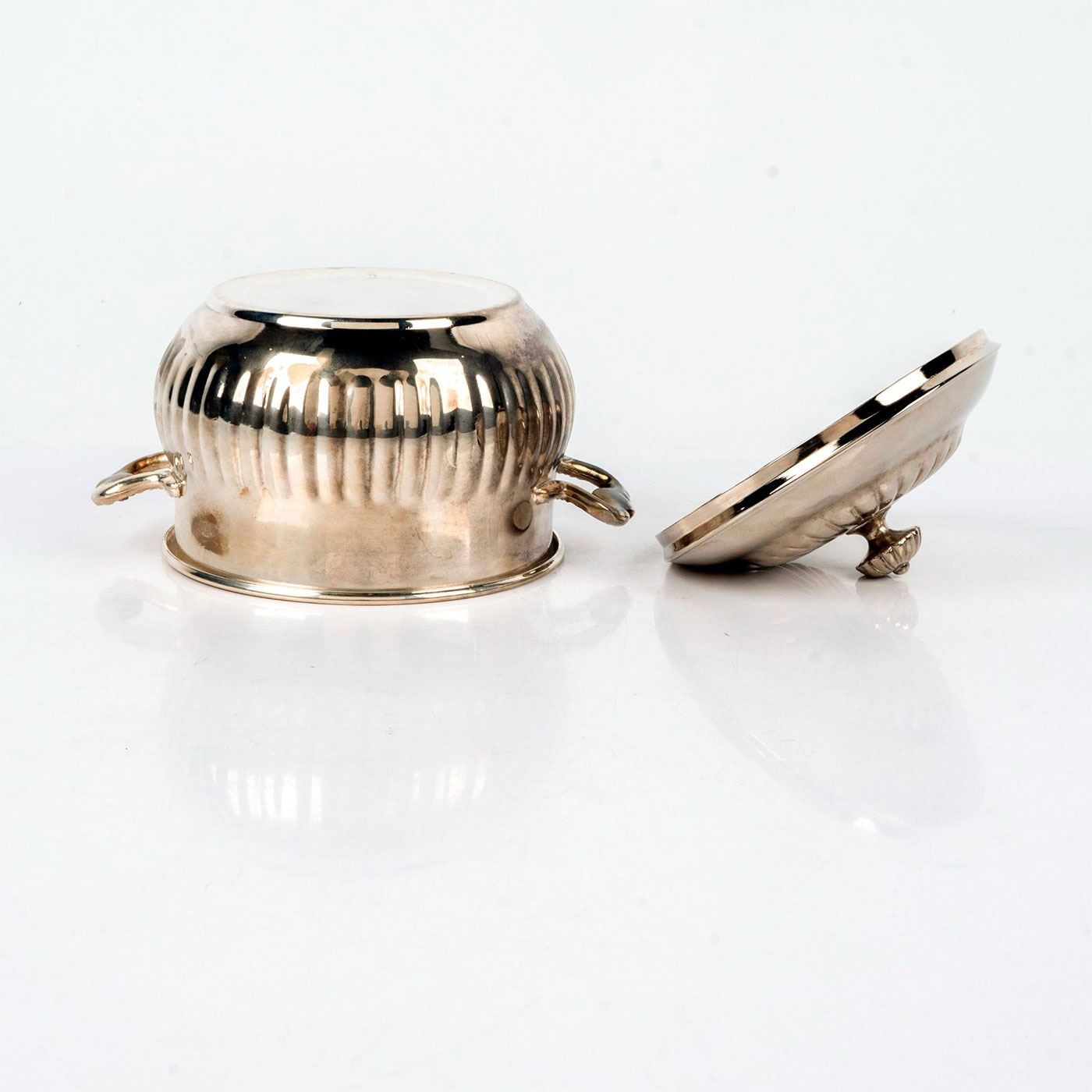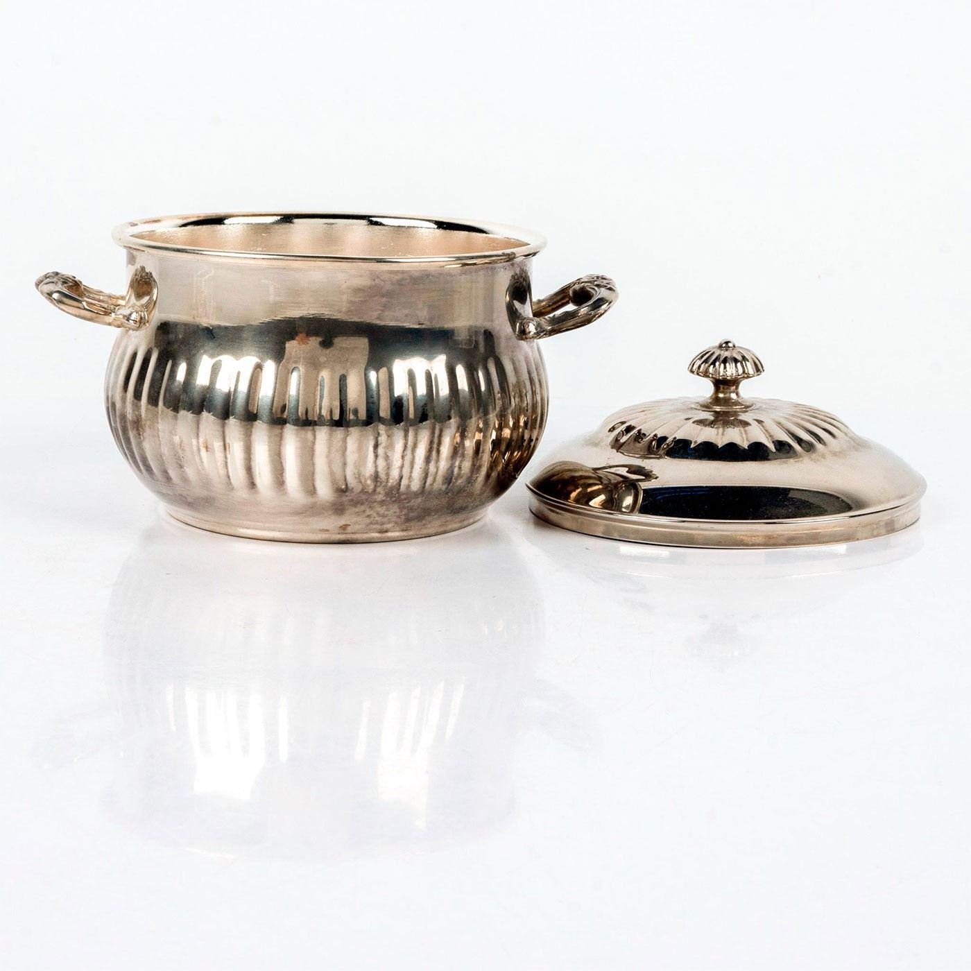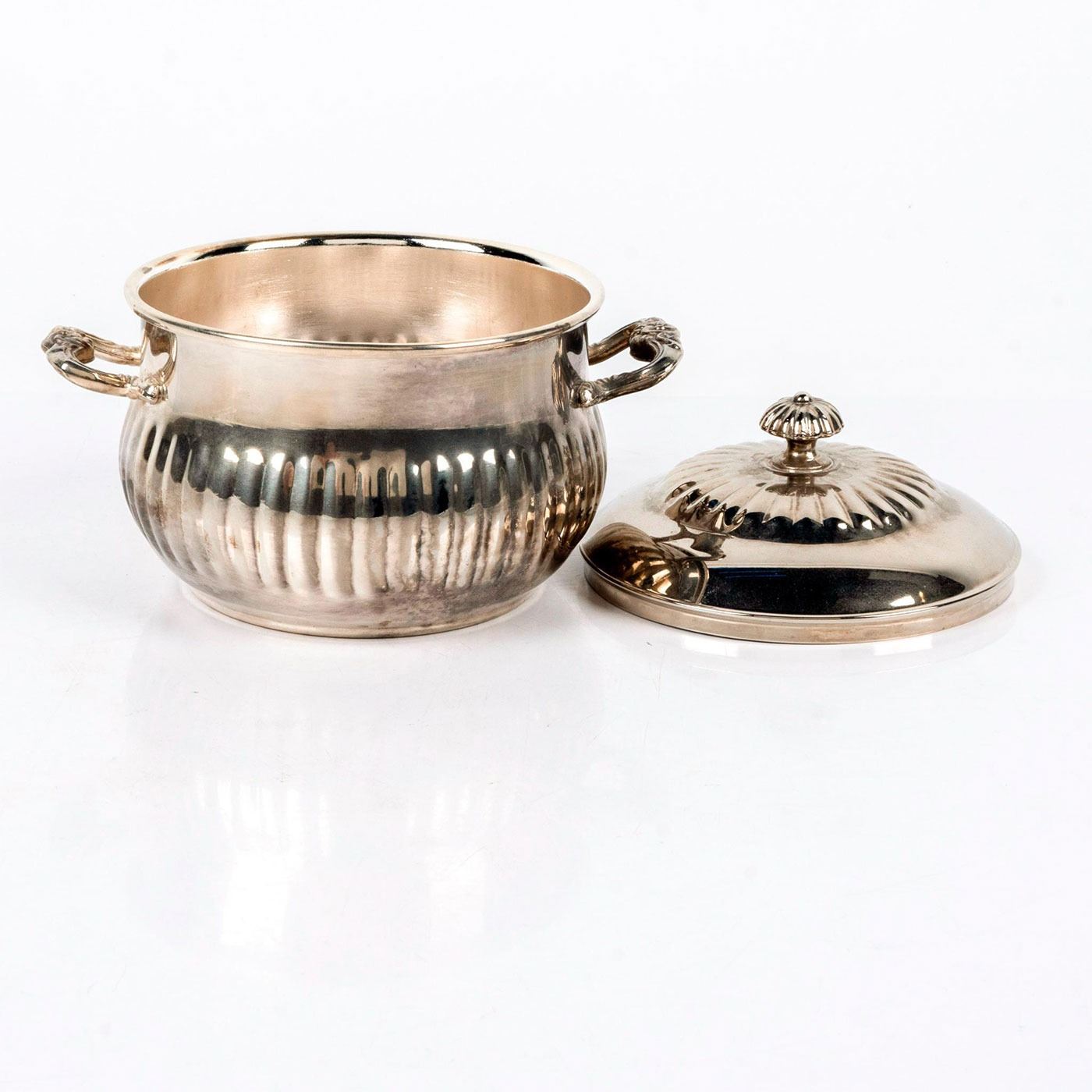 Made from silver plate with ornate handles. Ridged pattern on base and lid. Discoloration throughout.