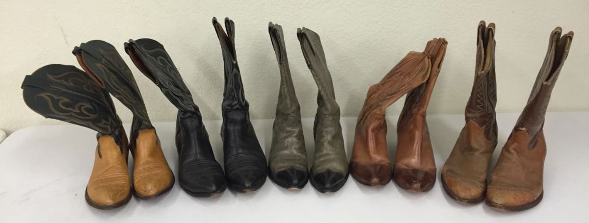 There are 5 different pair of vintage cowboy boots included in this group. It looks like the two smaller pair are a ladies size 6.5 or 7. The three larger pair appear to be a men's size 10 to 10.5. Please look closely at the pics as they are an important part of our description. Shipping: There will be a $10 handling / packaging fee for shipping this lot. The actual cost of postage will be added on top of that.