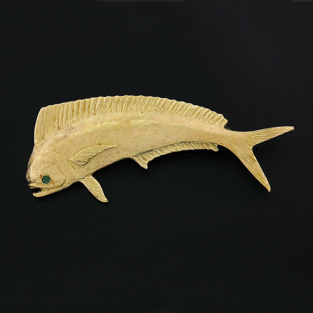 A vintage solid 18k yellow gold dolpin fish brooch by Craig Drake, with 1 round brilliant cut natrual emerald (0.02ct). Measures 19.10x46.80mm and weighs a total of 9.31 grams.