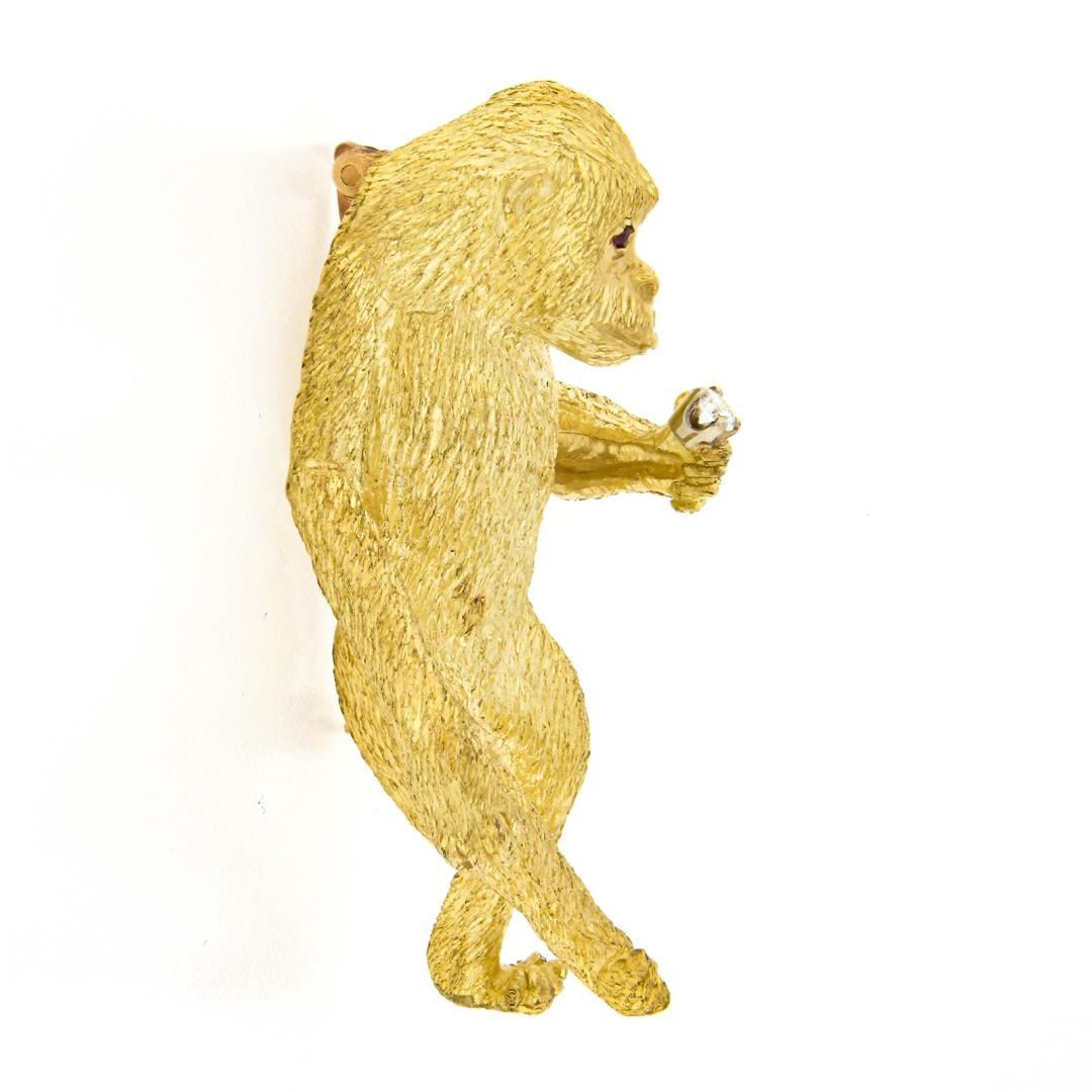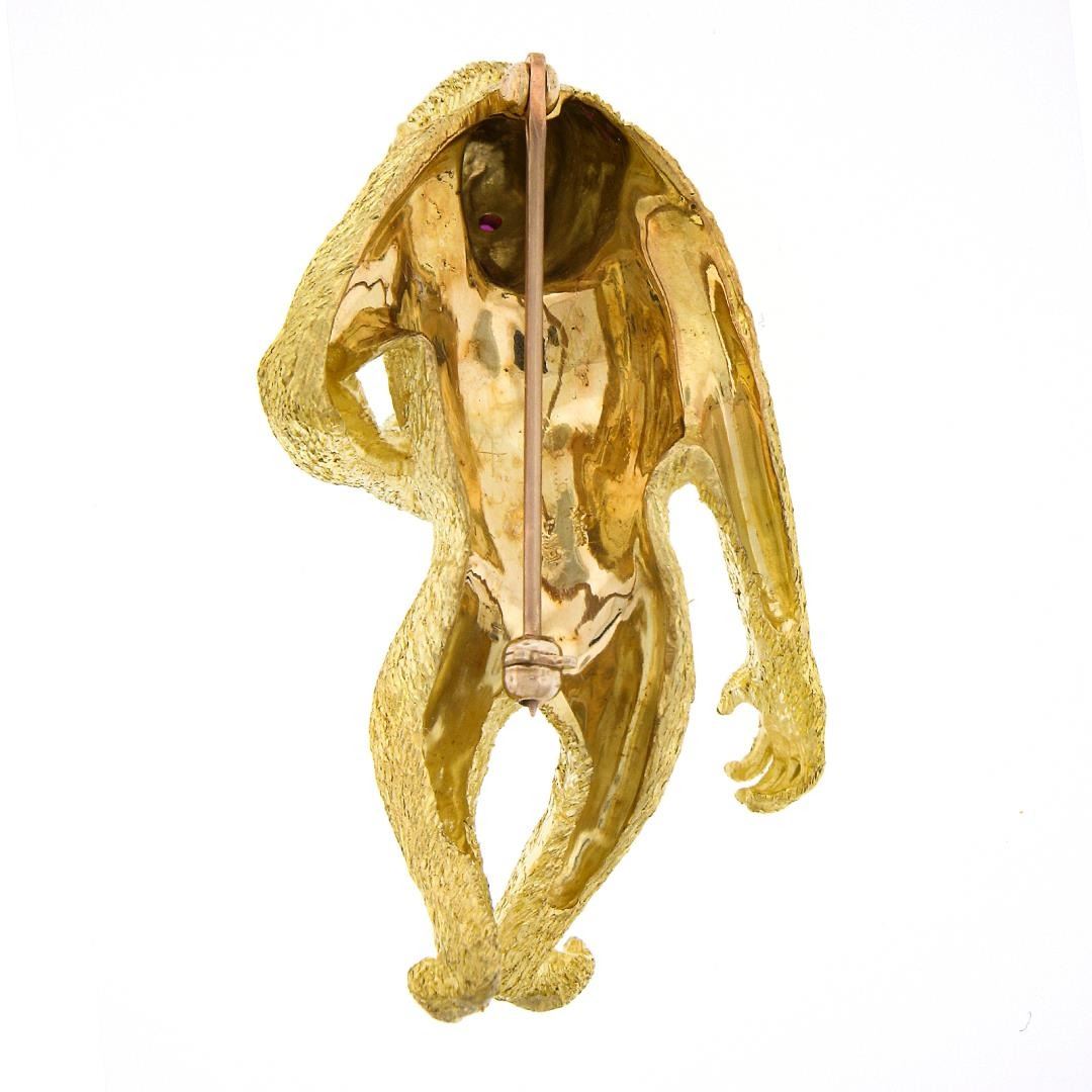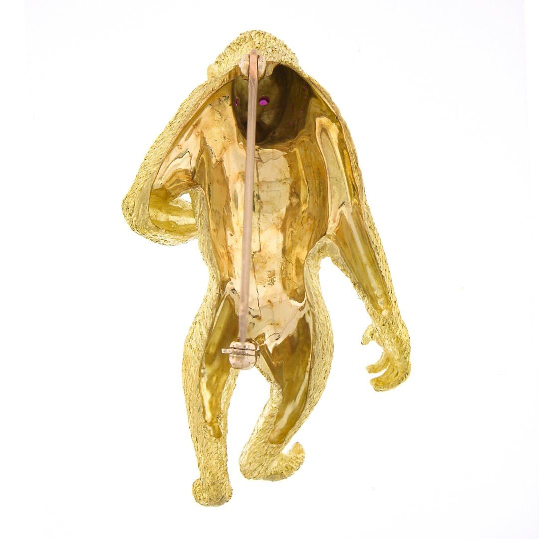 A vintage solid 18k yellow gold craig drake gorilla brooch. with 2 round brilliant cut natural rubies (0.03ctw), and 1 round brilliant cut natural diamond (F - VS1 ; 0.06ct). Measures 48.10x29mm and weighs a total of 23.81 grams.