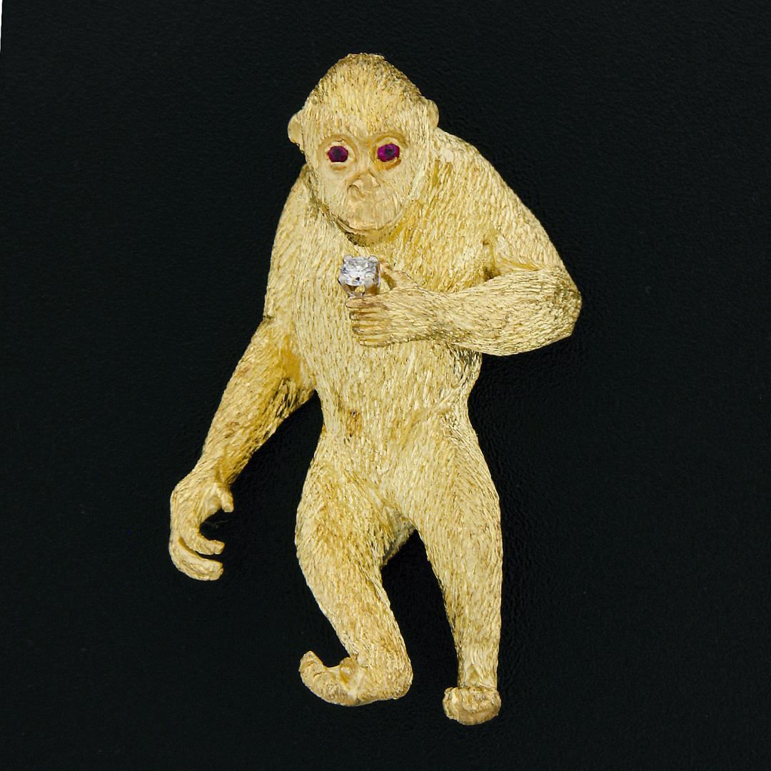 A vintage solid 18k yellow gold craig drake gorilla brooch. with 2 round brilliant cut natural rubies (0.03ctw), and 1 round brilliant cut natural diamond (F - VS1 ; 0.06ct). Measures 48.10x29mm and weighs a total of 23.81 grams.