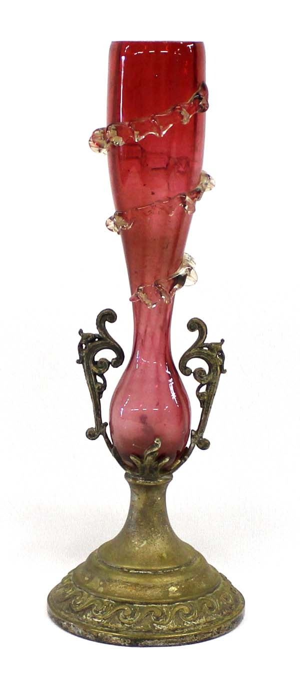 Antique/Vintage Cranberry Glass Vase on Ornate Metal Base, some damage to glass swirl around vase, measures 4'' x 11.5''