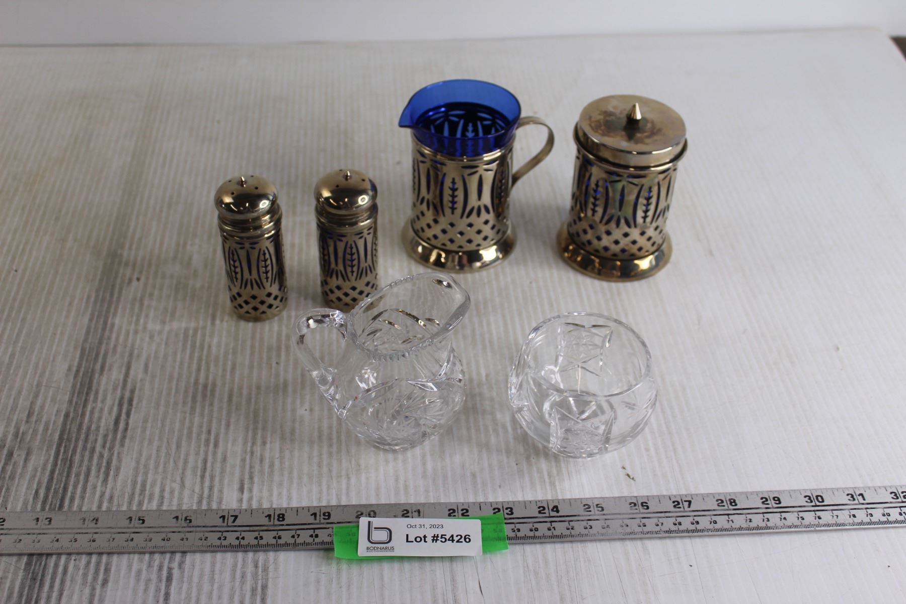 Vintage Creamer Sugar Set Bowl Cobalt Blue Glass Inserts w/ Matching Salt and Pepper Shakers + Glass Sugar and Creamer Set