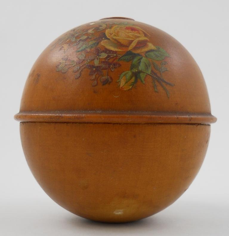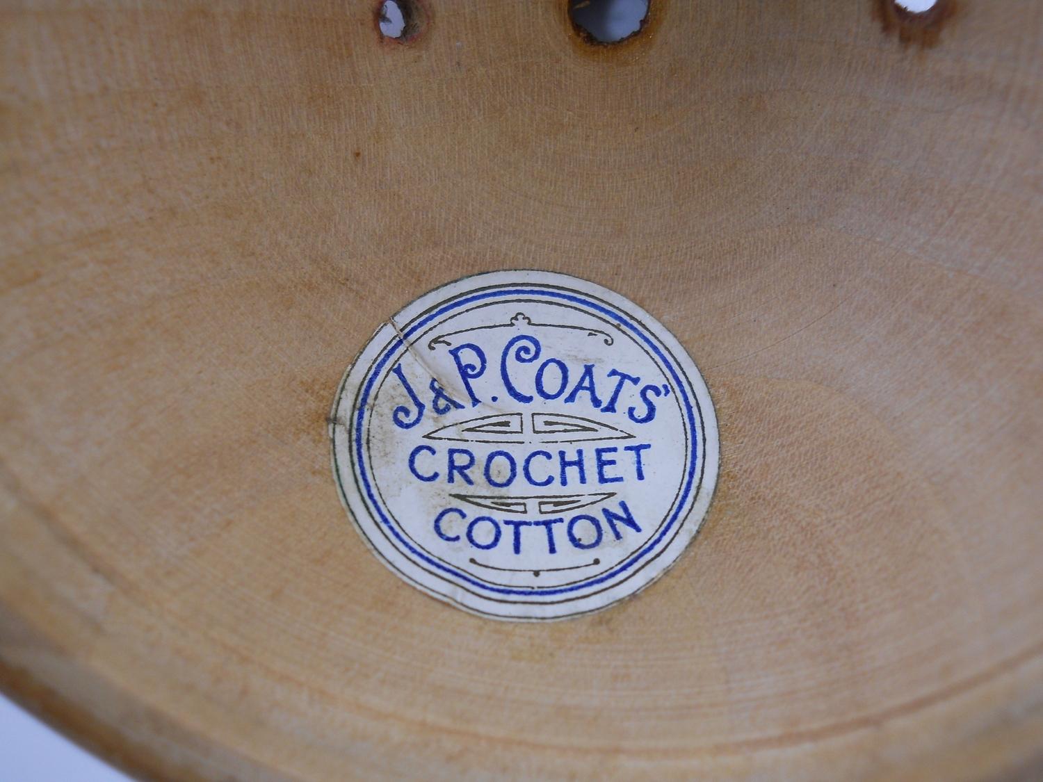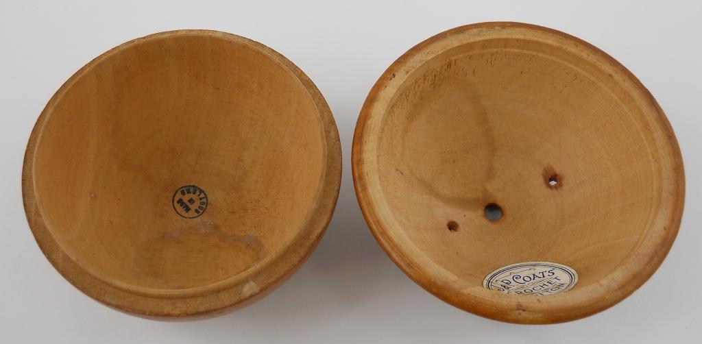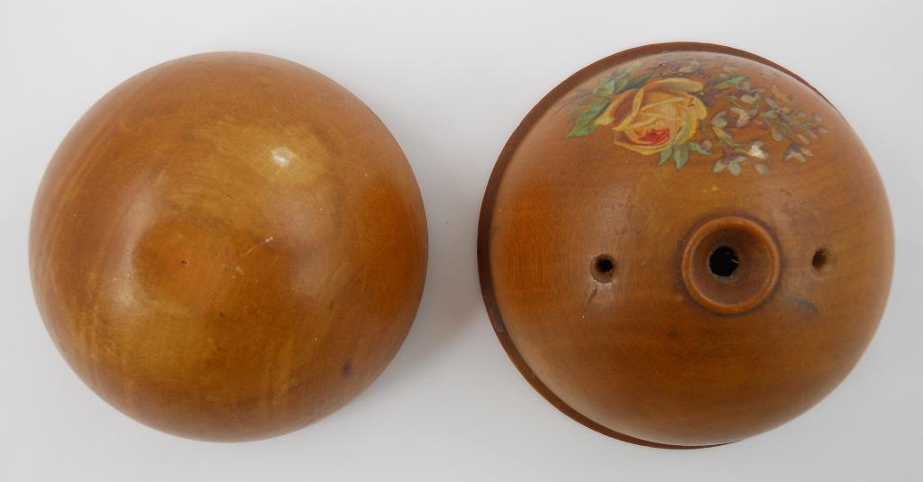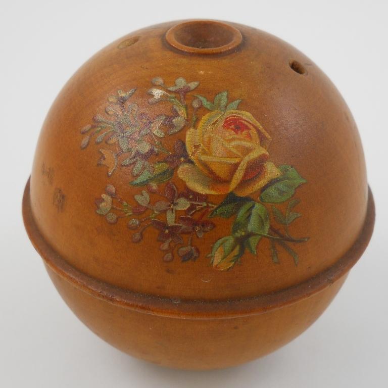 This wooden ball was made in Scotland for J & P Coats. It has three small holes in the top half, where you could feed out different strings to use as you did your crocheting.