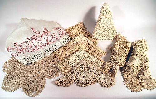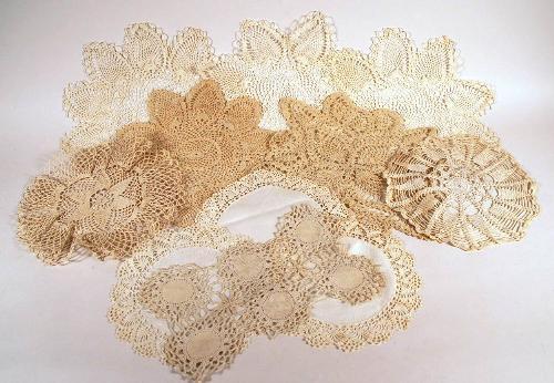 21pc lot of crocheted pieces to include table runner L 44" x W 10", and various sized doilies. Wear consistent w/age.