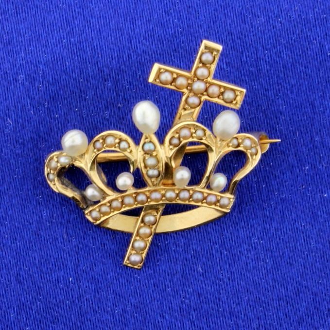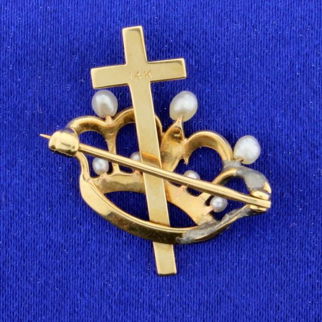In 14k yellow gold this pin contains 34 seed pearls ranging from 1.5mm to 3.7mm. It is 1 inch long. 3.2g