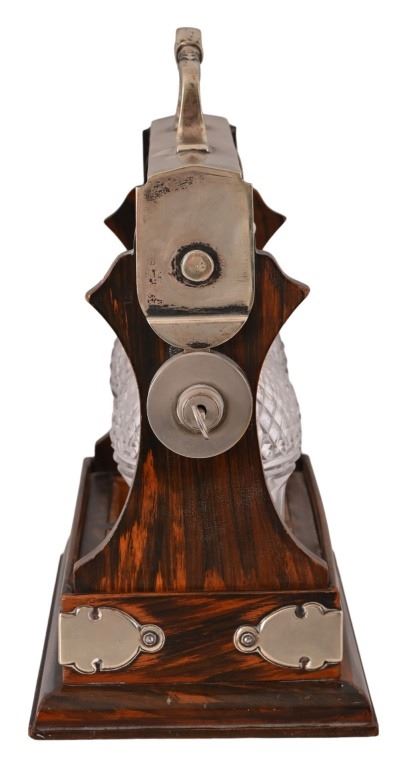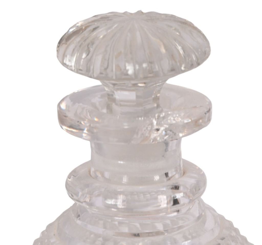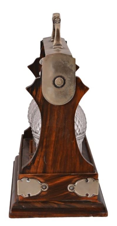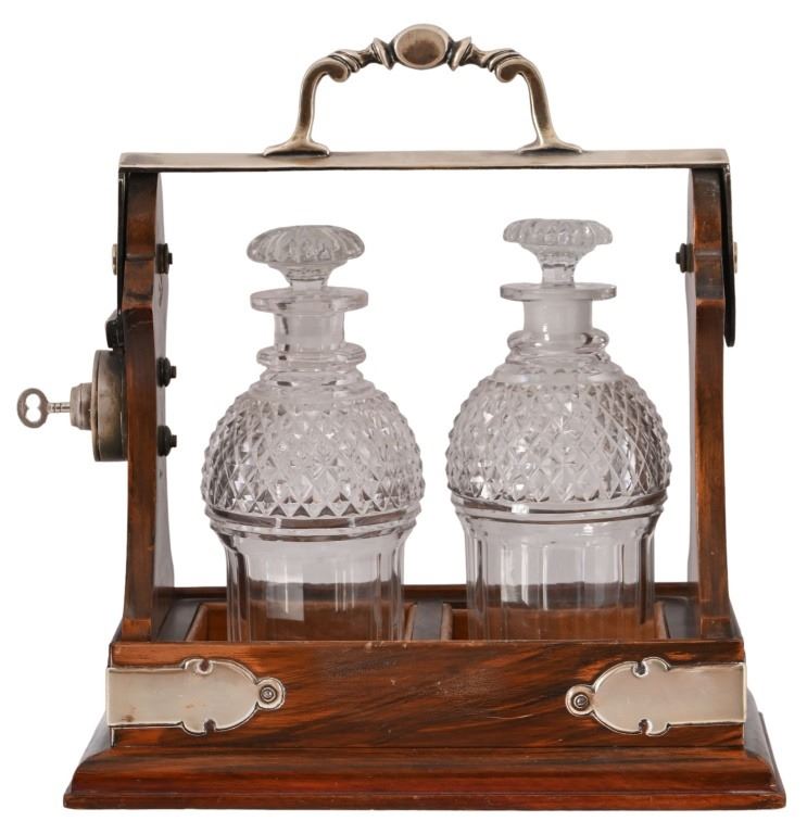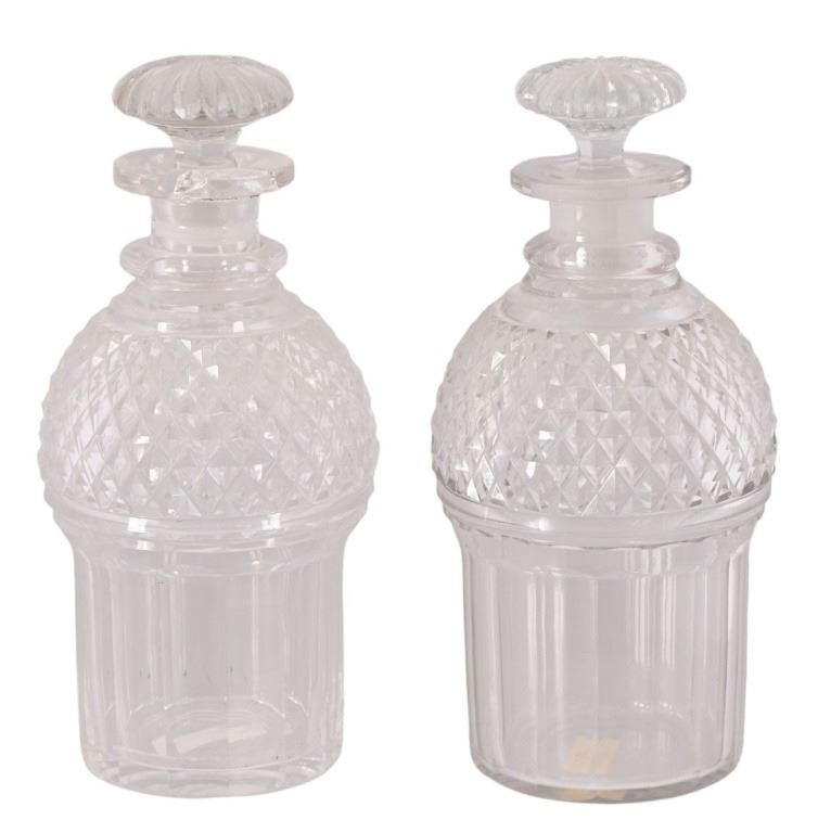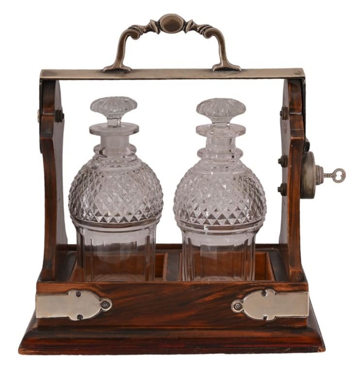 One Decanter is chipped. Decanters measure 8" tall. Carrier measures 6" x 11" x 12".