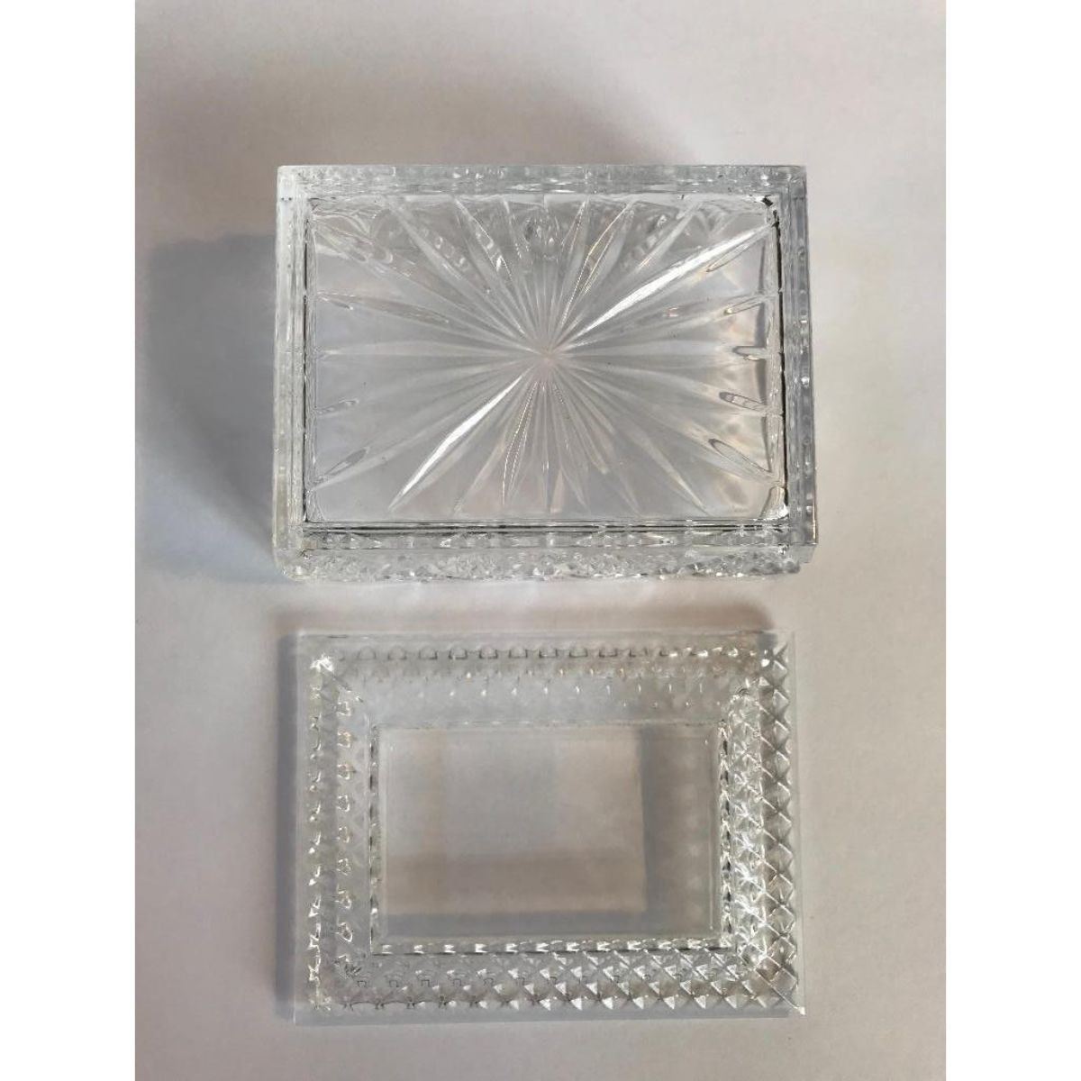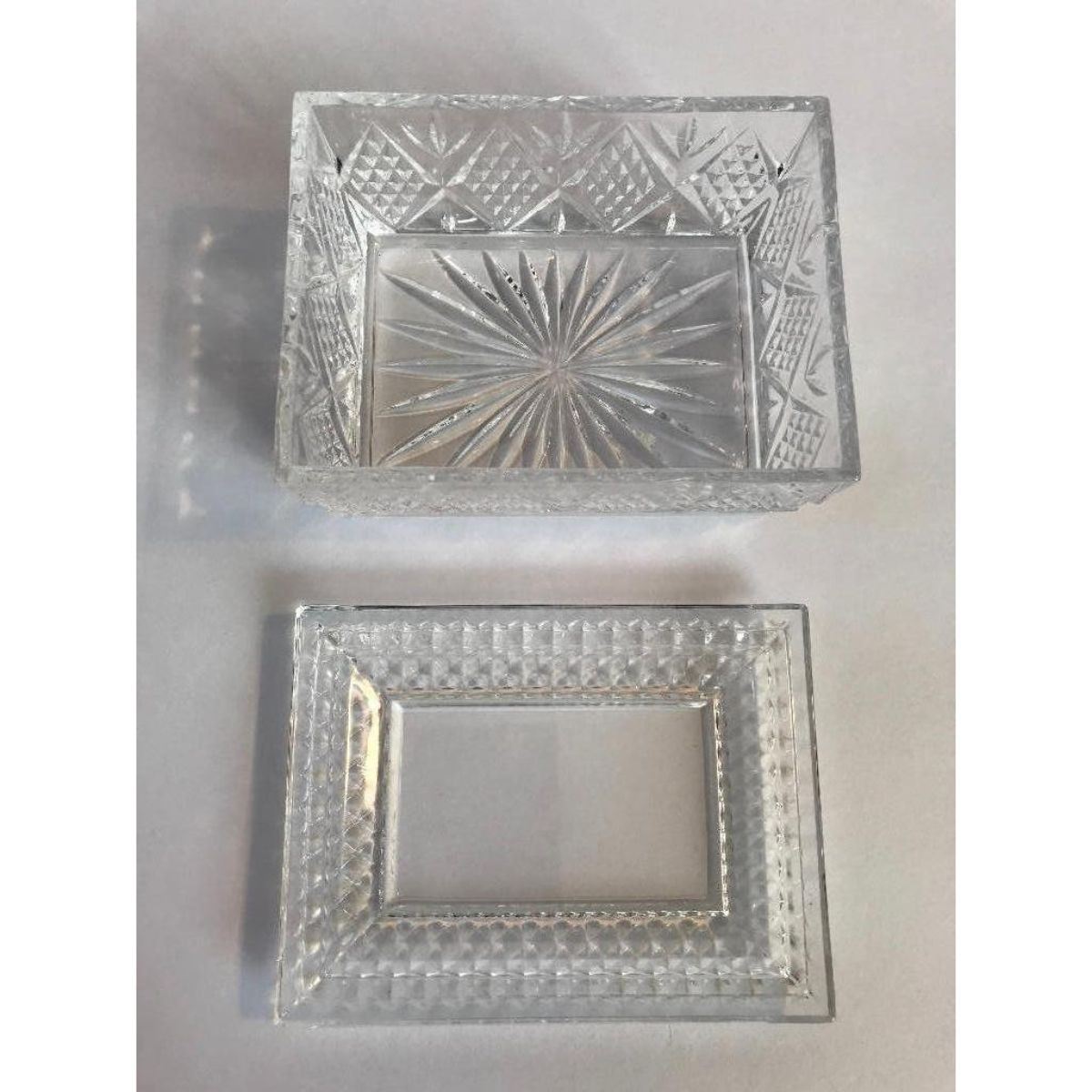 Vintage crystal trinket or jewel dresser box casket with diamond pattern & star pattern bottom. 3 1/2" W X 4 3/4" L X 2 1/2" H.Â