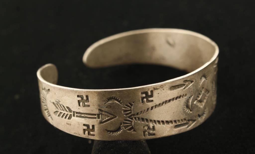 Vintage Native American cuff, probably made for the tourist trade in the early 1900's. One can date the cuff because of the whirling log symbols stamped on the cuff. That symbol was never used after the late 1930's due to its association with Hitler and the Nazi party. Many other Native American symbols are stamped into the metal including arrowheads, arrows, sunrise, feathers.
