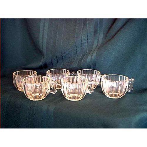 Cups of clear glass with square handles and vertical lines. Set of 6 vintage cups that measure 2.5 inches high and 3.25 inches wide. 3 of the cups have flea bites on the rim but other than that they are in good condition.