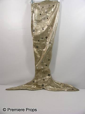 A vintage custom production made mermaid tail. A gold material with shiny gold circle embellishment throughout. Zipper in the back.