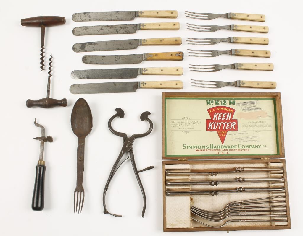 (1) Civil War era knife and fork set. (6) each in excellent condition with normal wear. Bone handles. Forks are unmarked, (5) knives are Beaver Falls Cut. Co and (1) knife is Imperial Cutlery Works. Also included is Keen Kutter Simmons Hardware Co knife and fork set. (6) each, all marked "Keen Kutter". In original box. (1) Collection of vintage kitchen utensil, (5) pieces including: (2) cork screws, can opener, sugar tong, fork/spoon.