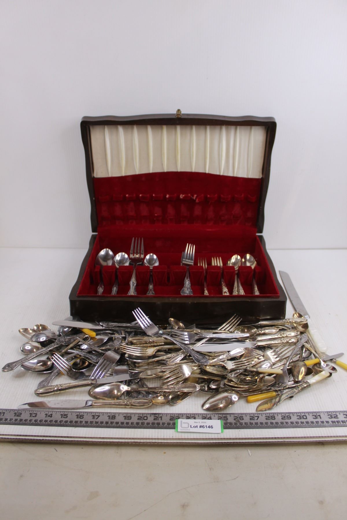 Vintage Cutlery with Wooden/Velvet Display/Storage Case 12" x 17.5" x 4"