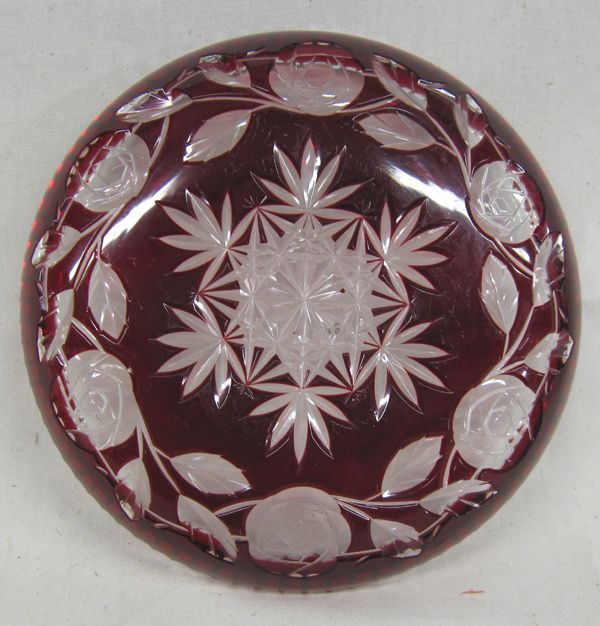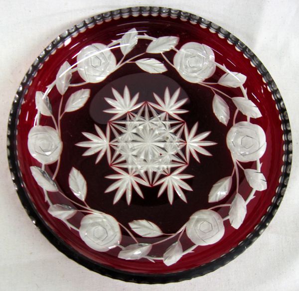 Vintage Czech Bowl Ruby Cut to Clear. Snowflake design in the center, surrounded by trailing roses and leaves. Measures 6'' diameter.