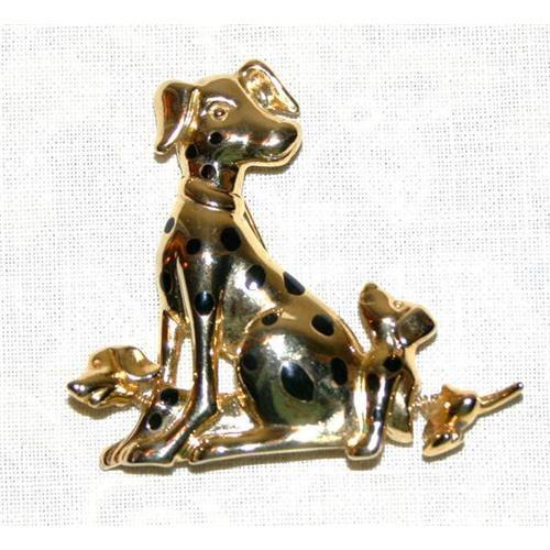 Made in the 1950s, this wonderful vintage whimsical Pin or Brooch is gold plated with black enameled spots, depicting a Vintage Figural Trembler Brooch of a Dalmation Mom with her two pups! This Trembler Pin measures 2 inches long and 2 1/4 inches wide. At the front of the mother Dalmation, sits a pup peaking around her paw, showing just the pups head attached to the trembler as if he is hiding behind her. Nestled behind her is another puppy which is part of the main pin with its hind-end,paw and tail attaching to the trembler. Pin stem set on a slight angle running the length of the Brooch.
