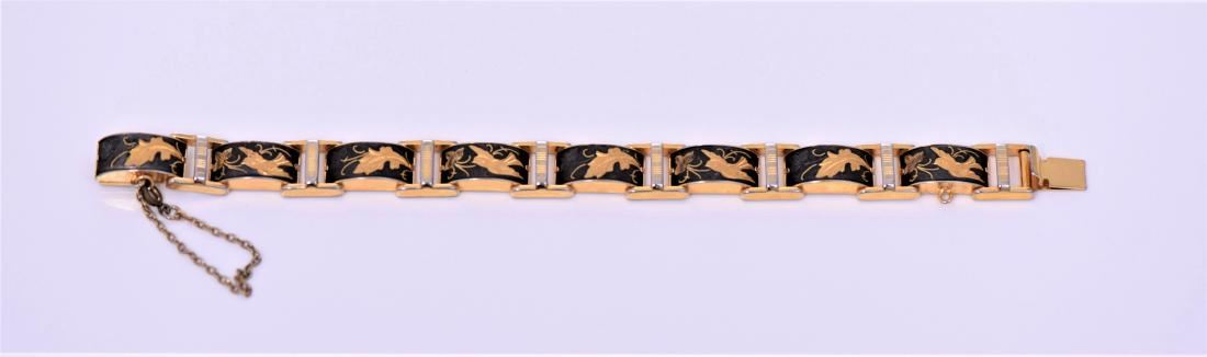 Vintage Damascene Bracelet Linked Birds Flowers Black Gold Enamel And Gold Tone/Plated. Estimated less than 50 yrs old. (Pangaea Auctions) Size and/or Weight: See Measurement Photo. (Photos Represent The Lot Condition.)