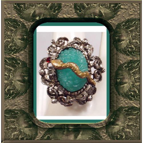 Look Out CLEO the serpents are out tonight and guarding this precious cabochon ( jade colored molded glass) full of magic! This is a vintage piece that has a setting that is 1 1/3" long. The inside cabachon is a bumpy glass ( called molded glass) that seems to have a glow from inside. The gilt snake wraps itself across it and is soldered on each side and used to hold the magical stone inside. The ring is adjustable and will go up to an 8. Made of heavy silver metal it is in very good vintage condition.
