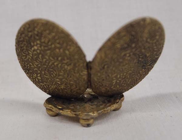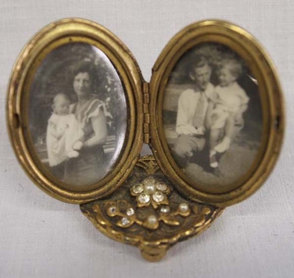 Vintage Decorative Locket on Stand. Vintage piece with old pictures from the 1940's. Base of stand has rhinestones and pearls. Measures 2'' x 2.25''.